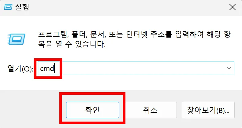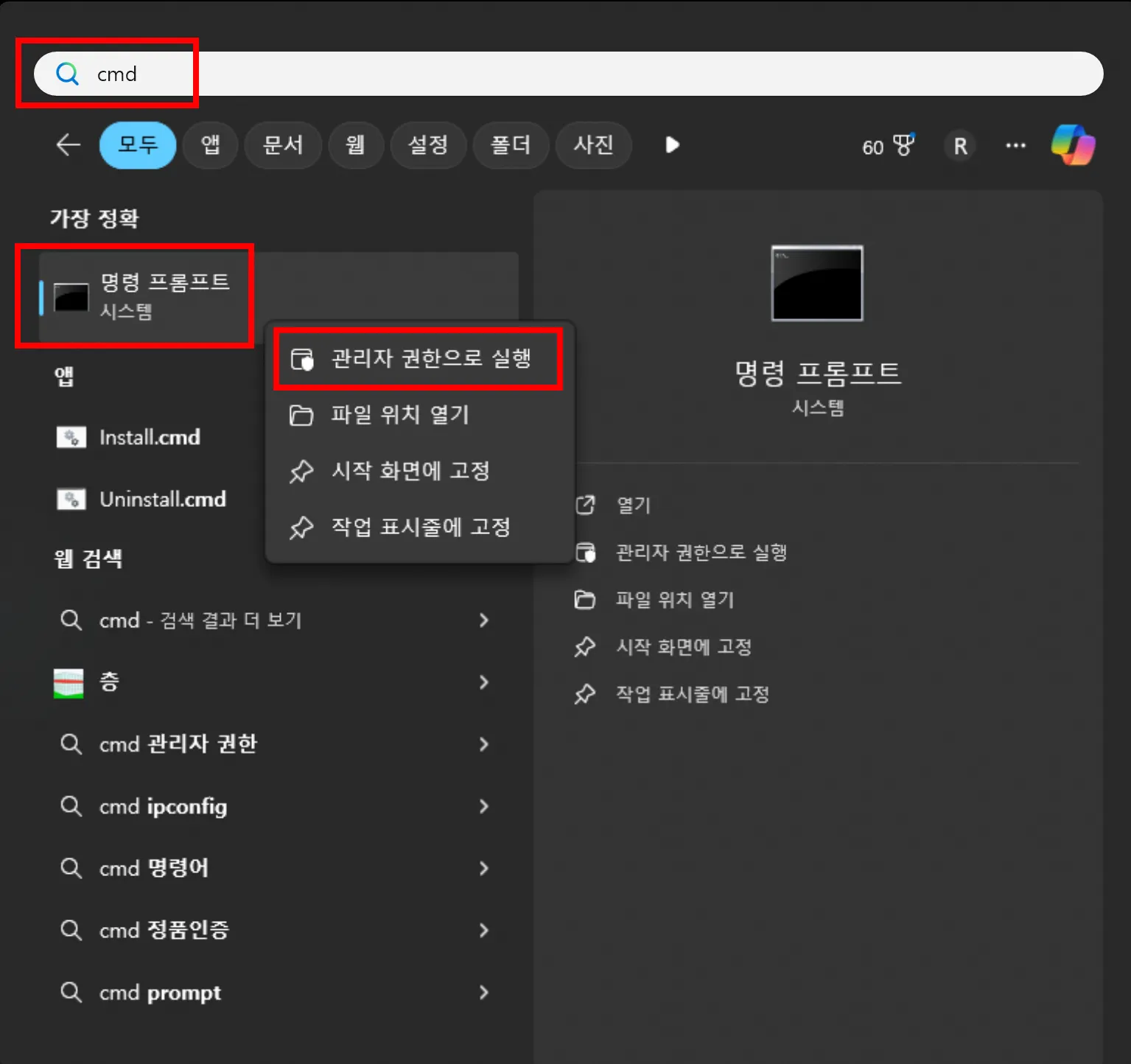 cmd(명령 프롬프트) 검색 > 관리자 권한으로 실행을 클릭해주세요.