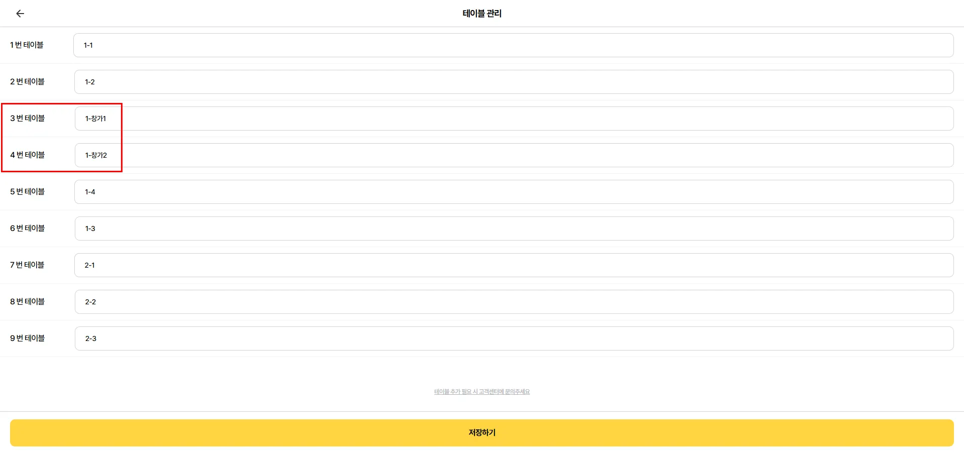 사장님페이지 > 포스관리 > 테이블등록에서 테이블을 더블클릭하여 수정후 저장해주세요.