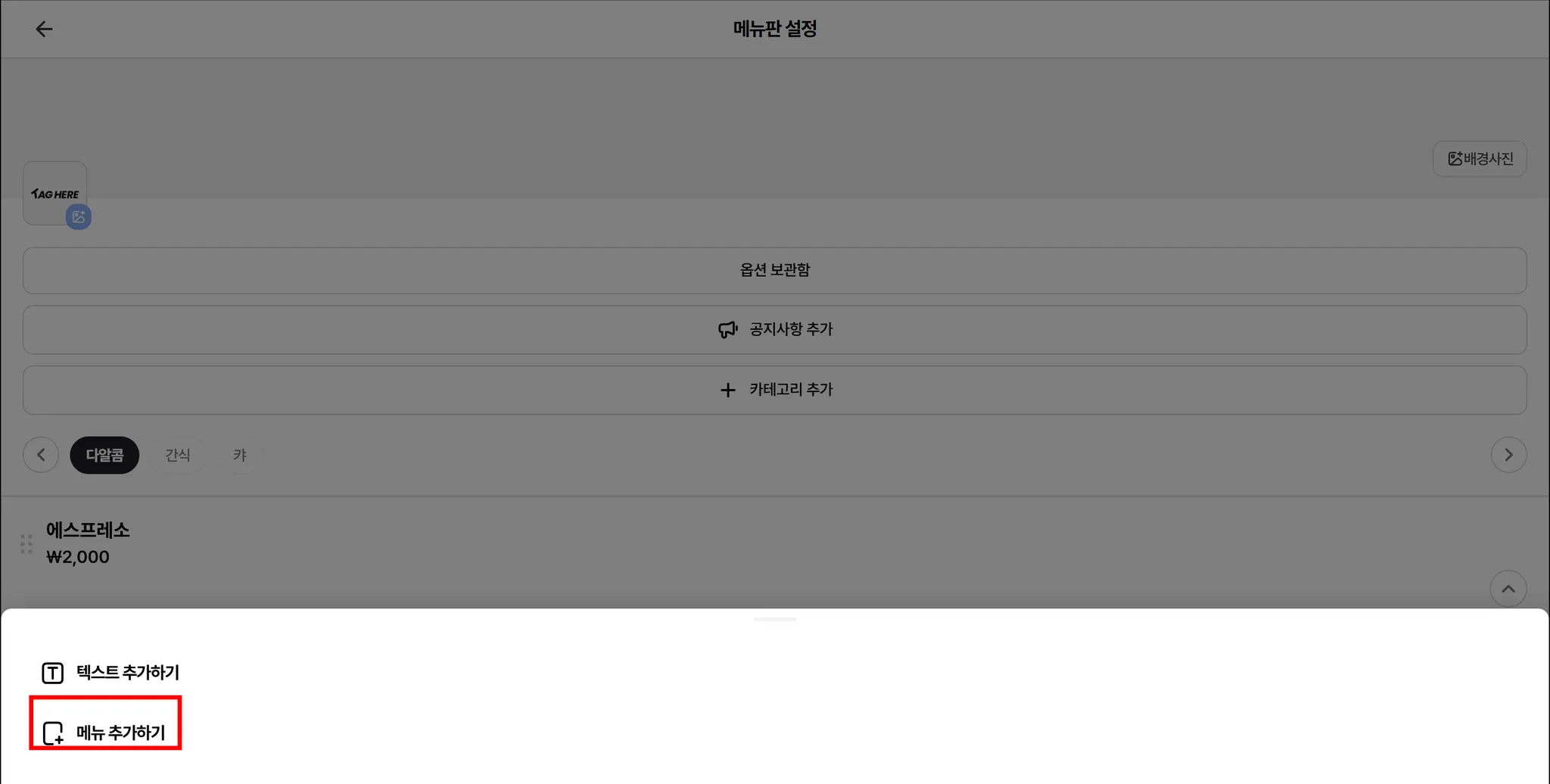 메뉴 추가하기를 선택해주세요.