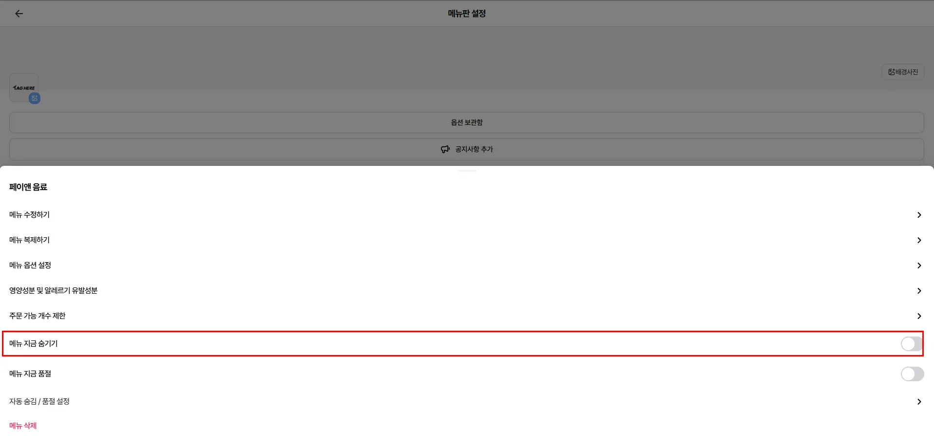 메뉴 지금 품절을 활성화해주세요.