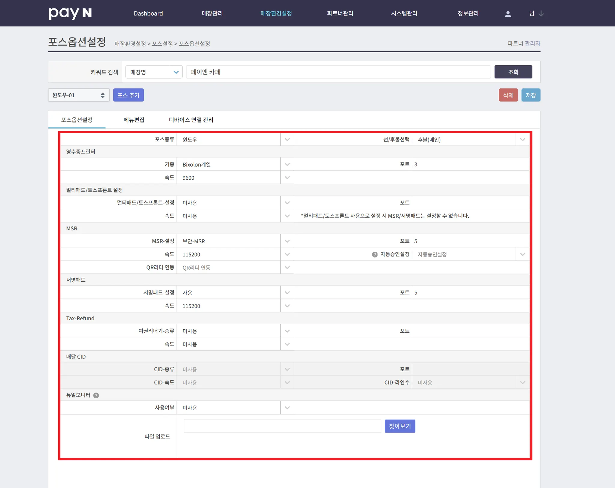 포스옵션 설정 후 [저장]을 눌러주세요.주변 기기 설정