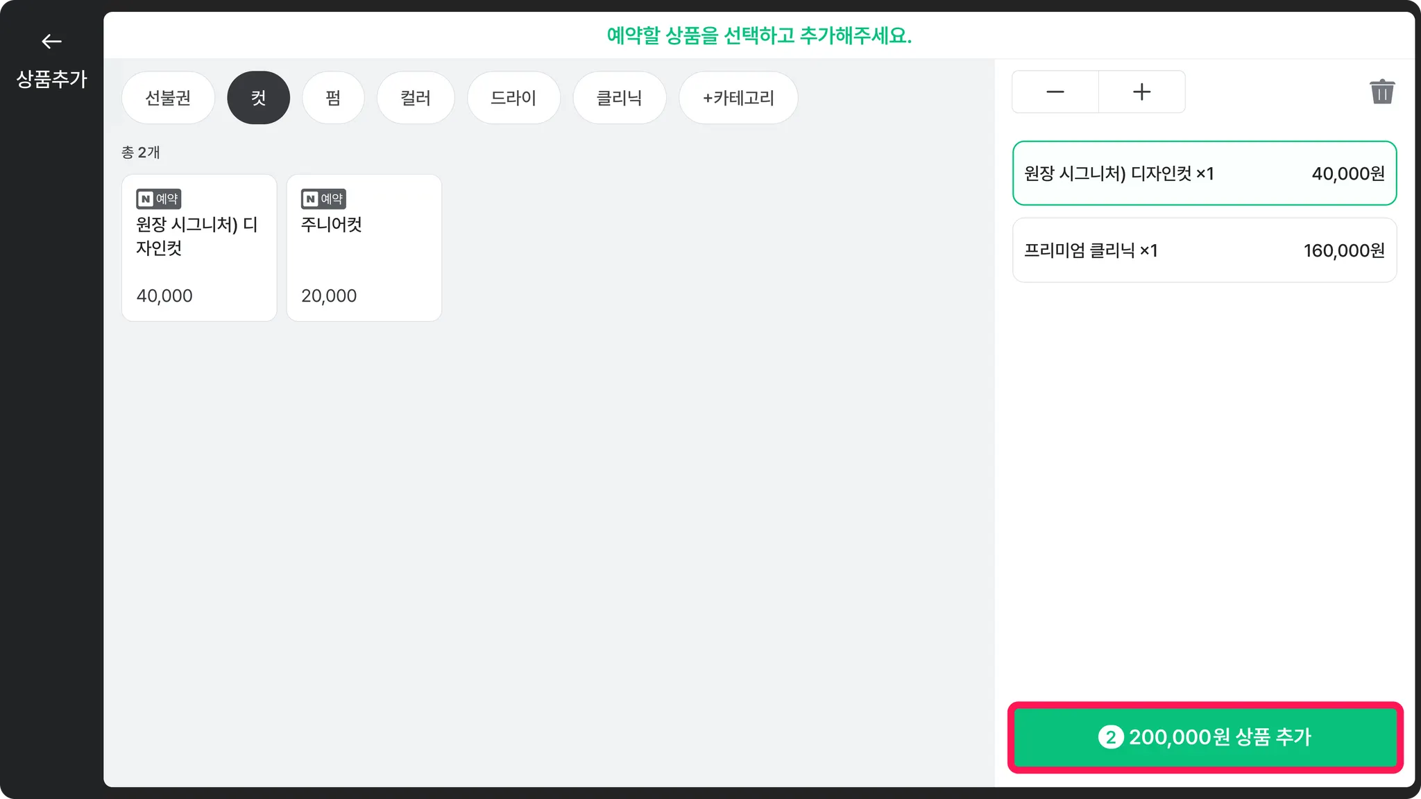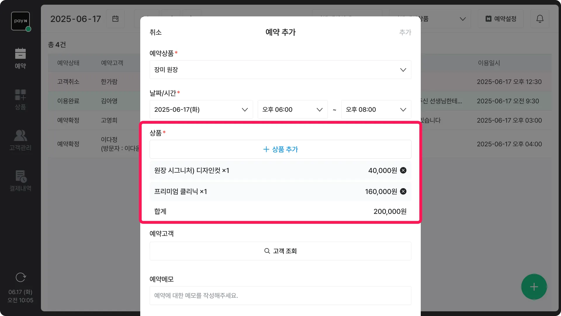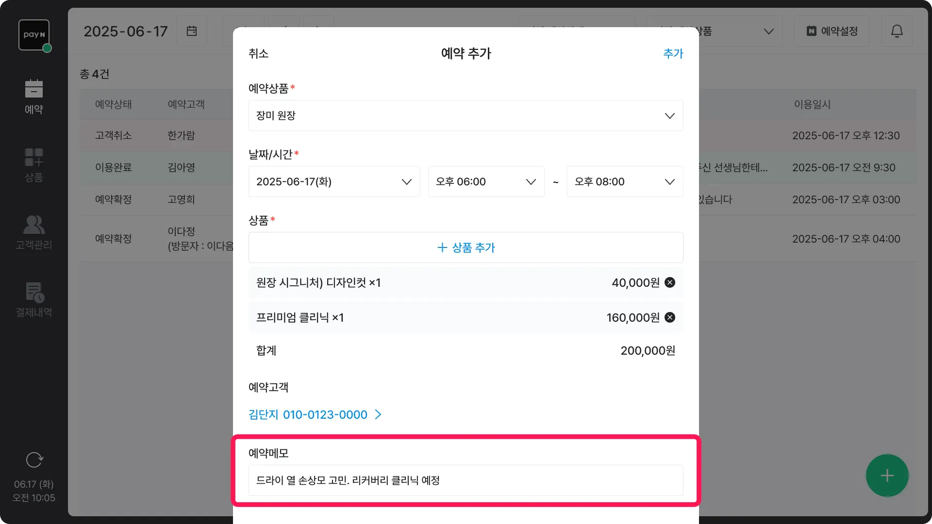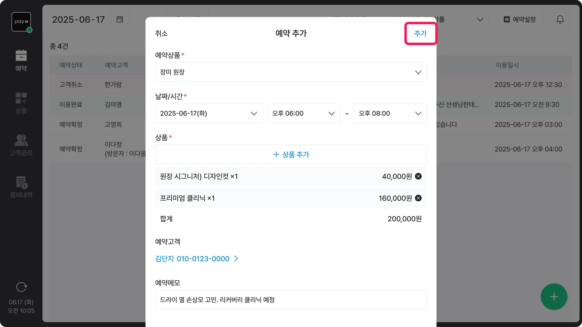 입력을 마친 후, [추가]를 누르면 예약이 생성돼요.예약 처리