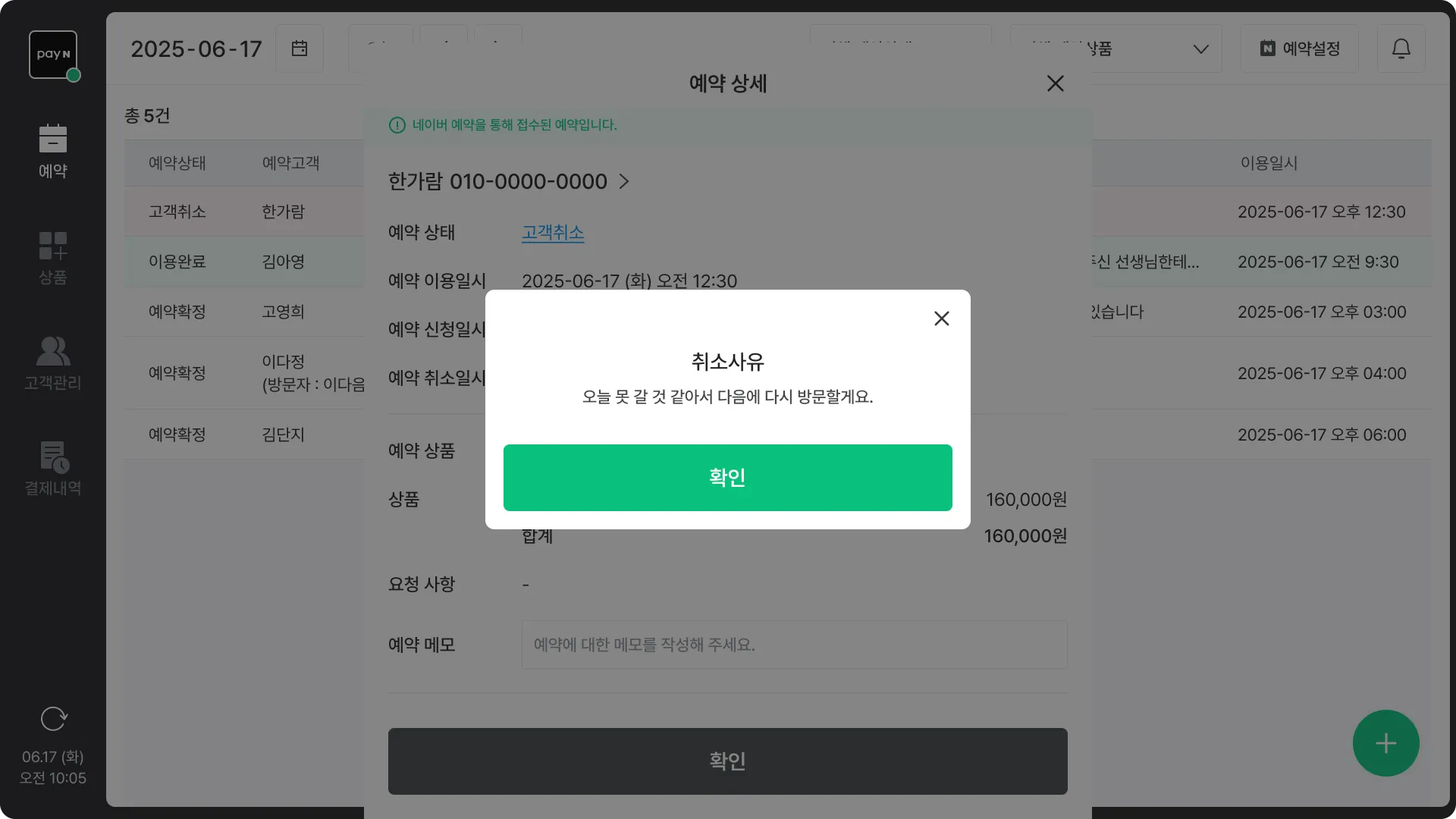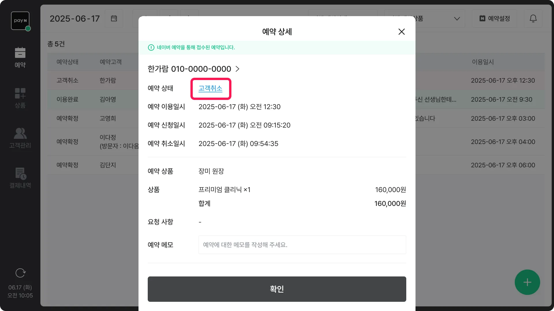 고객 취소 또는 네이버 예약 자동취소 예약 건의 경우, 예약 상세에서 취소 사유를 확인할 수 있어요.