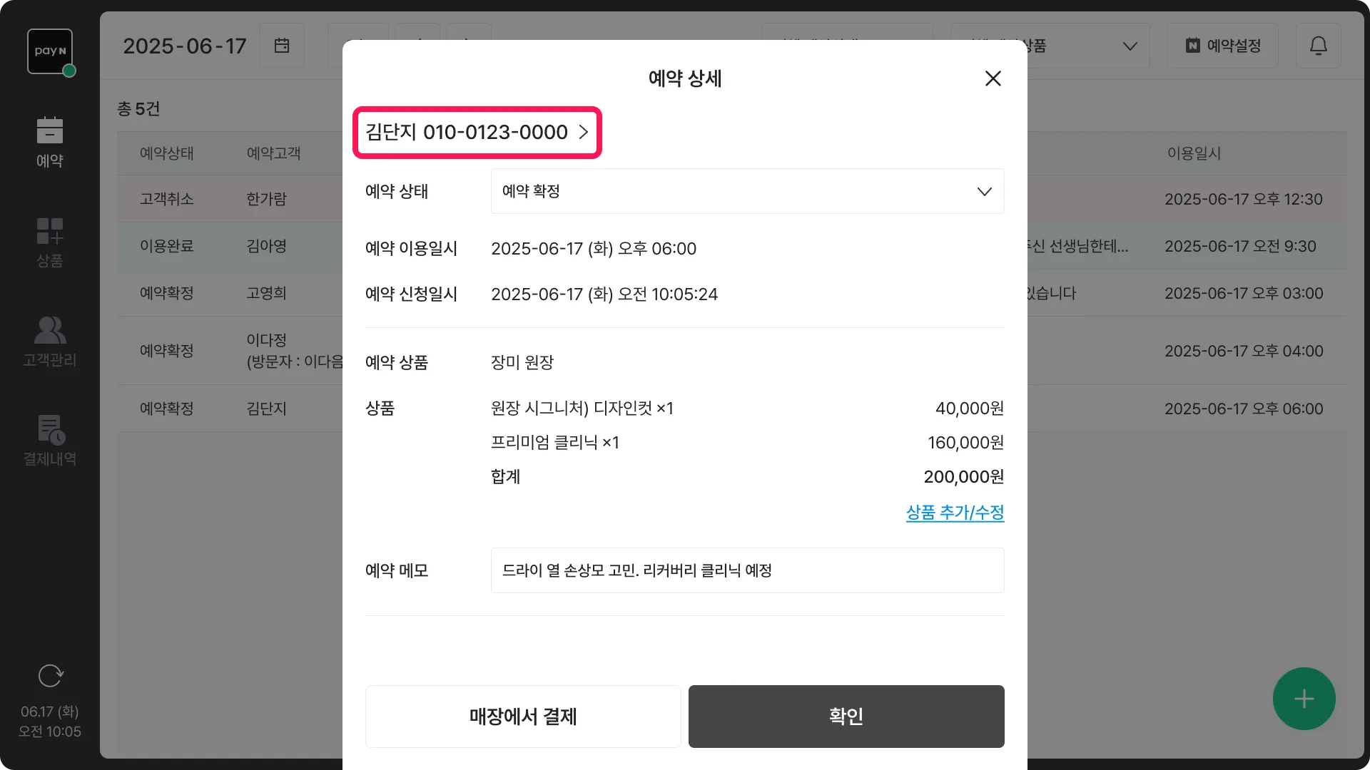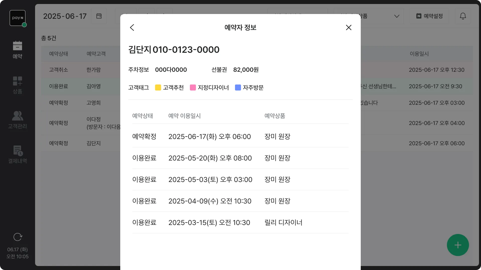 예약 상세에서 해당 영역을 누르면 고객 정보 및 예약 내역을 확인할 수 있어요.예약 취소