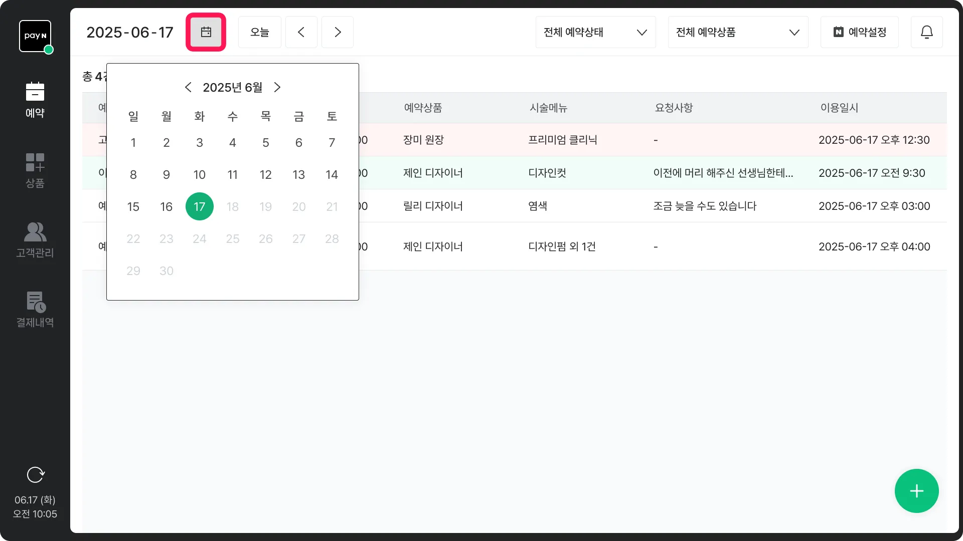 캘린더 또는 상단 탭을 통해 조건별 예약을 확인할 수 있어요.
