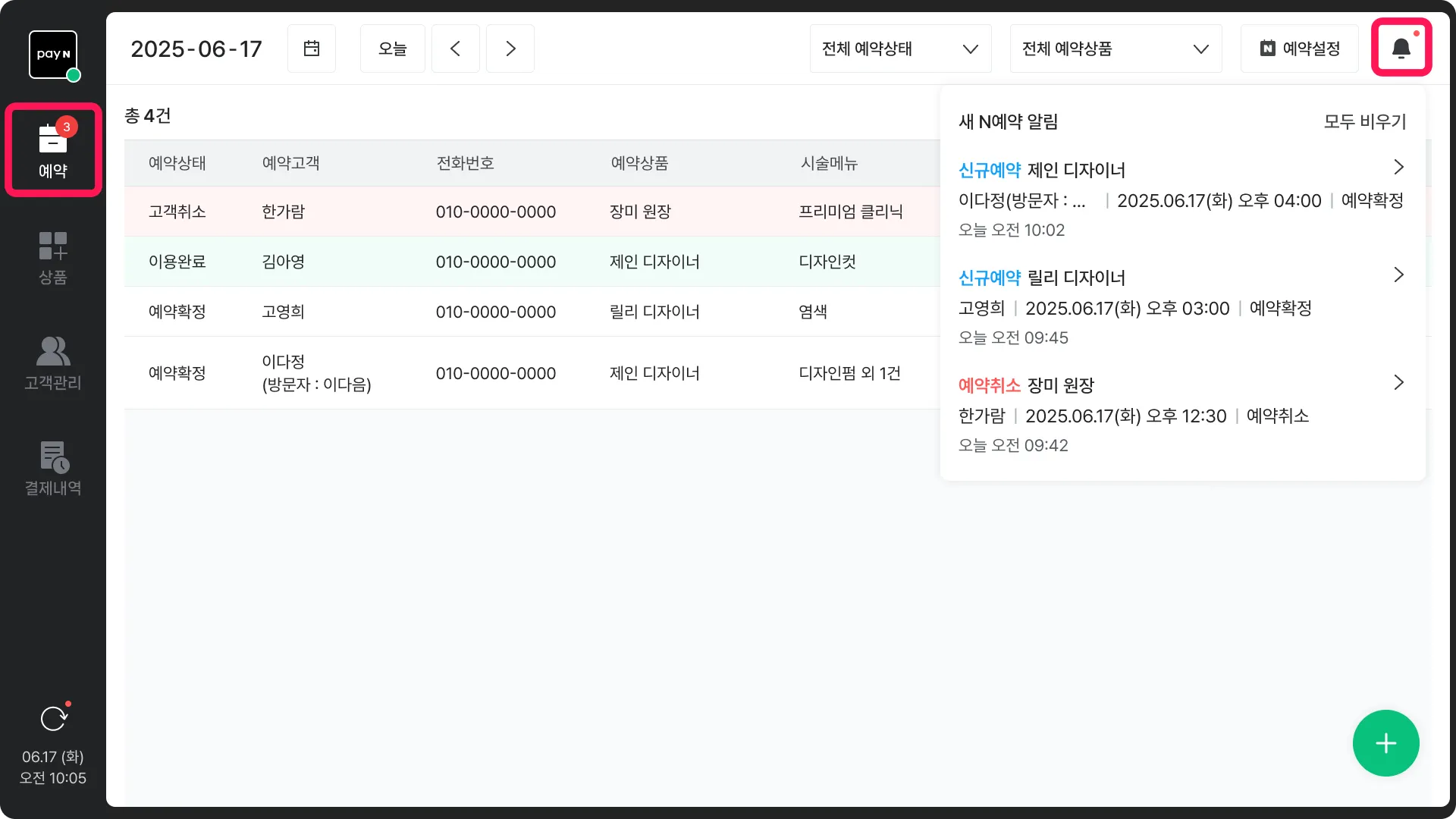 알림창에서 건별 예약 상세를 확인하거나 [모두 비우기]를 누르면 뱃지가 사라져요.