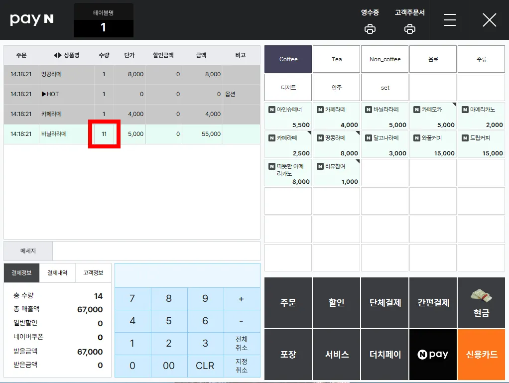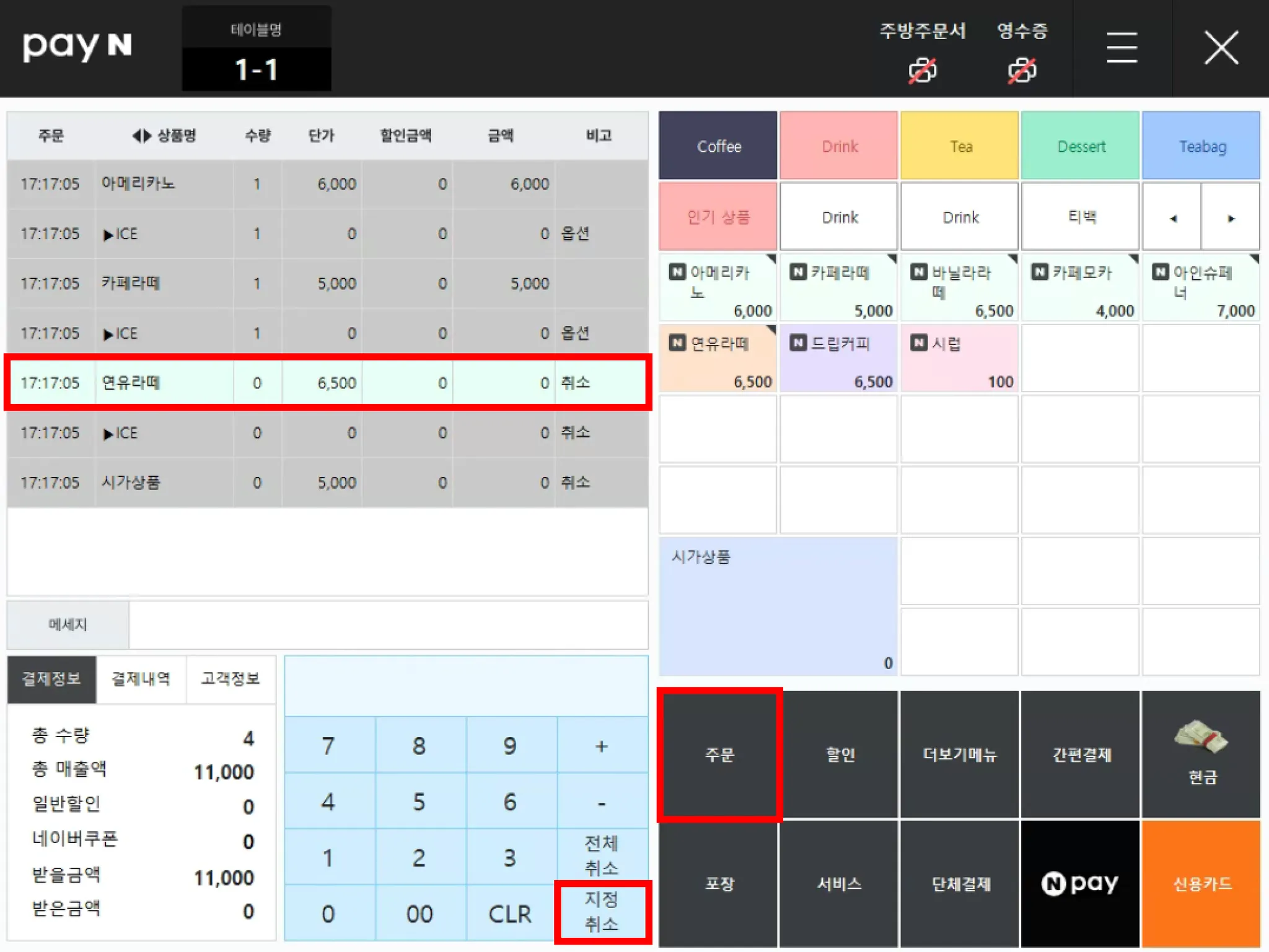 주문할 메뉴를 판매 터치키 영역에서 선택하여 추가하고, 주문 버튼을 눌러 주문합니다.