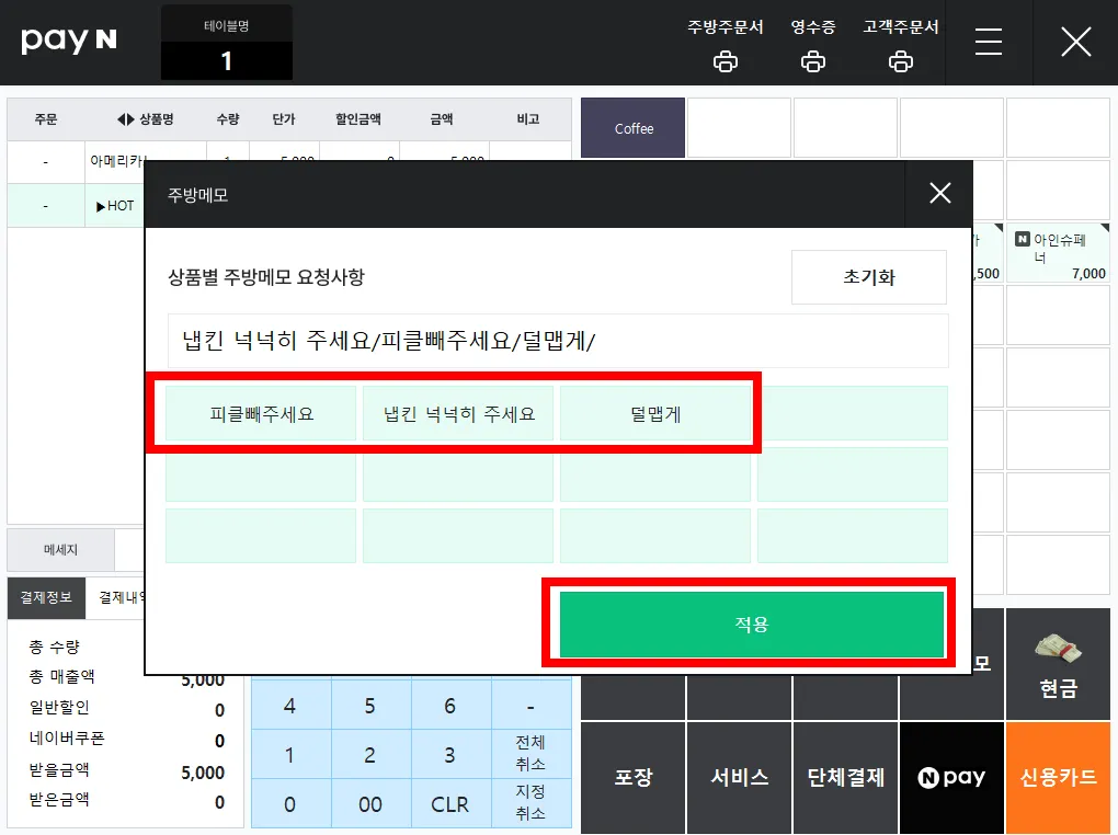 주방메모를 입력하거나 선택한 후 적용을 누른 뒤, 주문 버튼을 누르면 주문돼요.