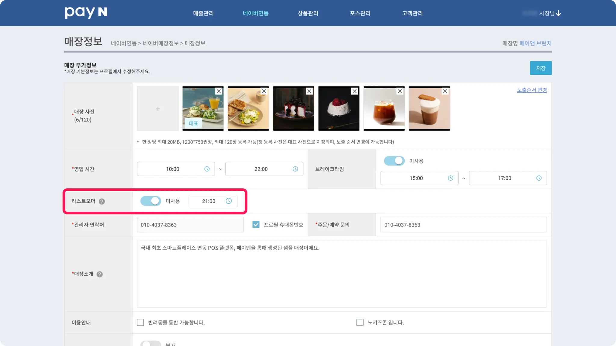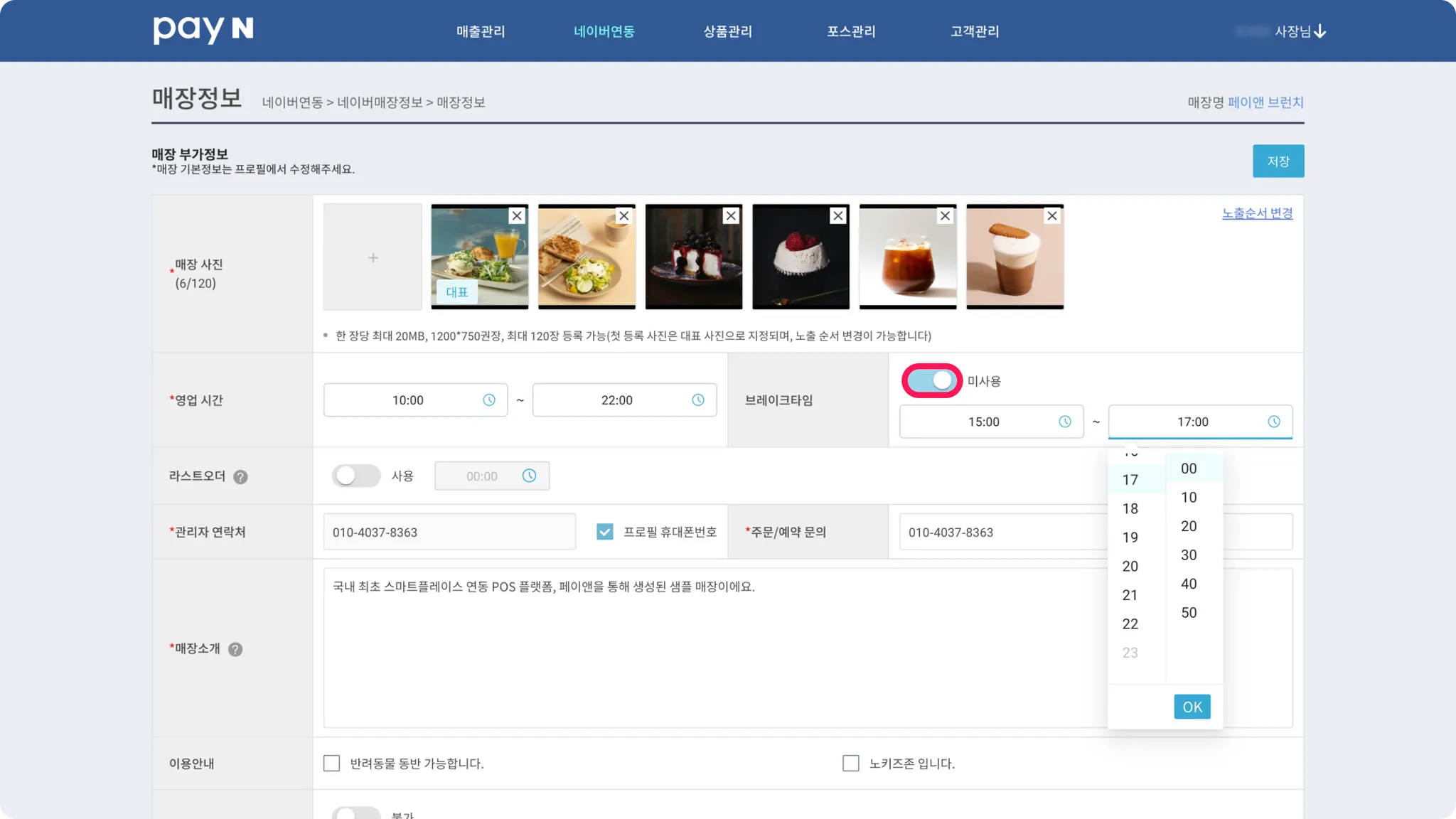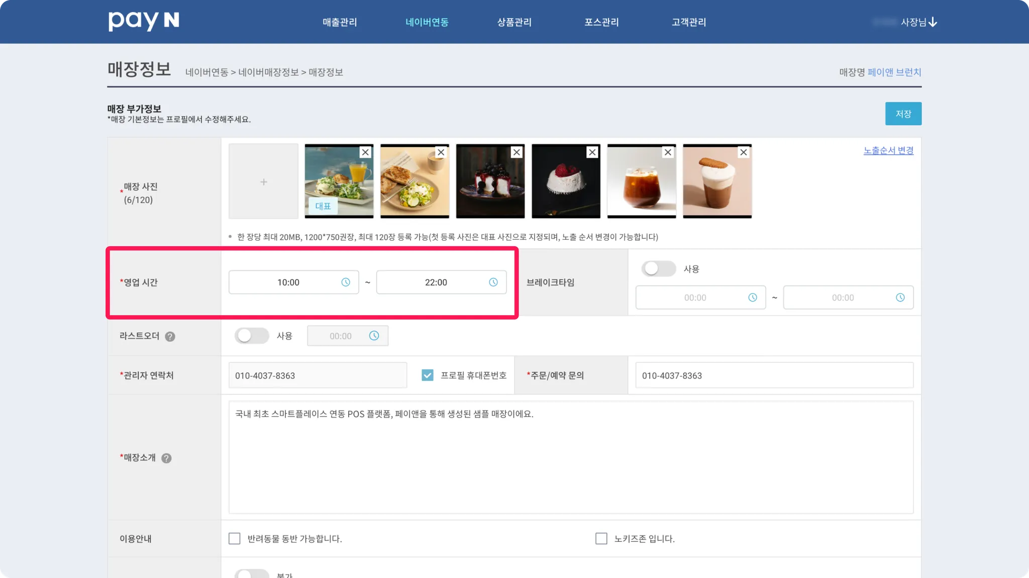 [네이버 연동] > [매장 정보]에서 영업 시간을 설정해 주세요.영업 시간은 네이버예약/주문 시간이에요.