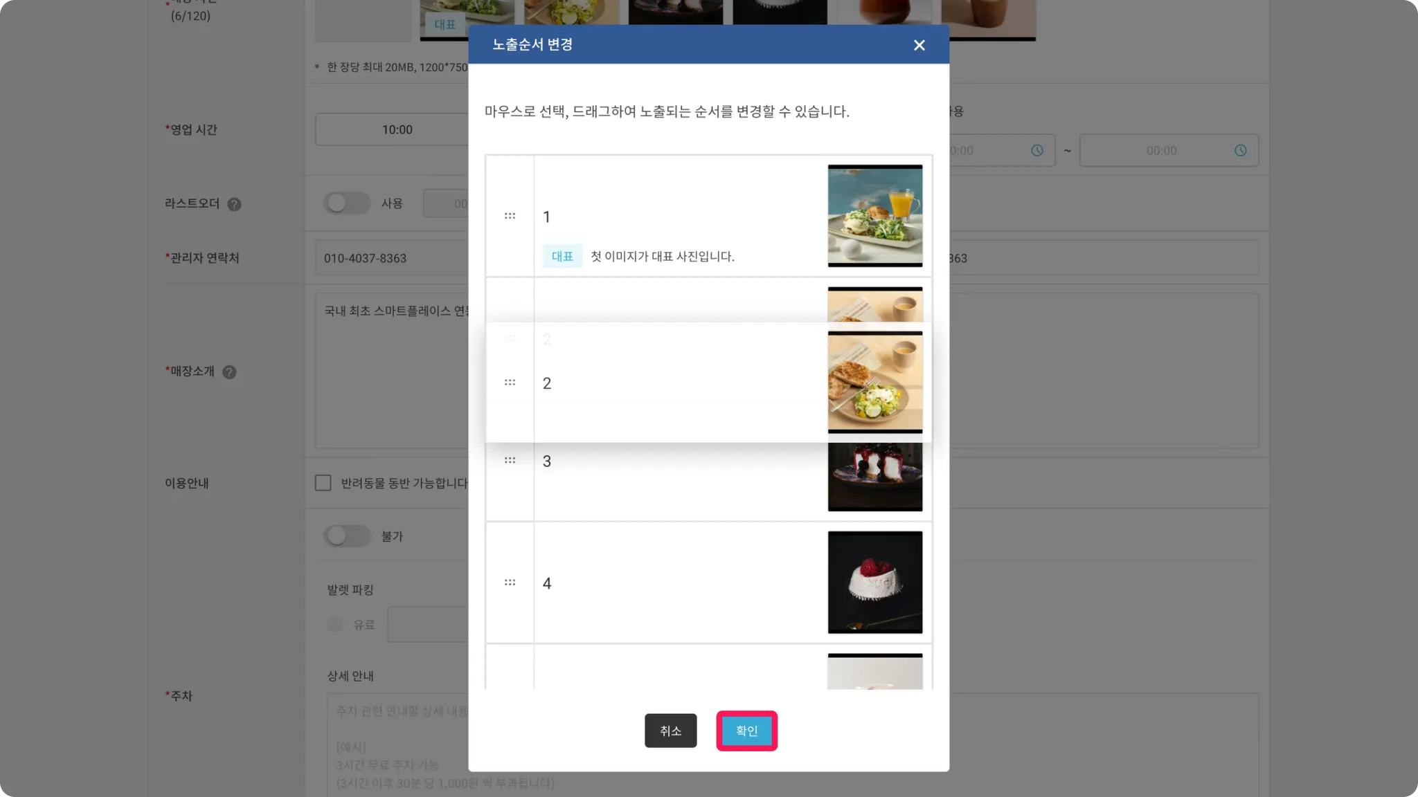 사진을 드래그하여 순서를 변경한 후, [확인]을 눌러주세요.영업 시간