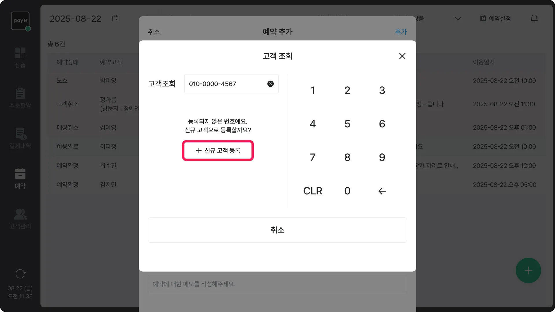 예약고객 : [고객 조회]를 누른 후, 기존/신규 고객을 등록할 수 있어요.