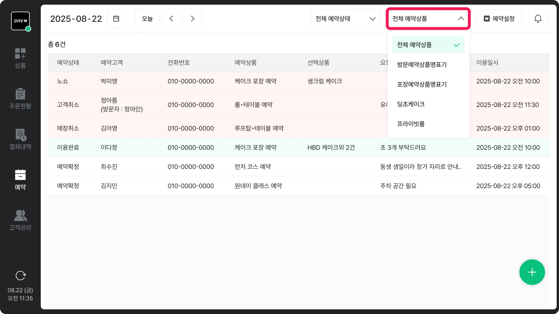 상단 [전체 예약상태] 또는 [전체 예약상품]을 통해 조건별 예약을 확인할 수 있어요.