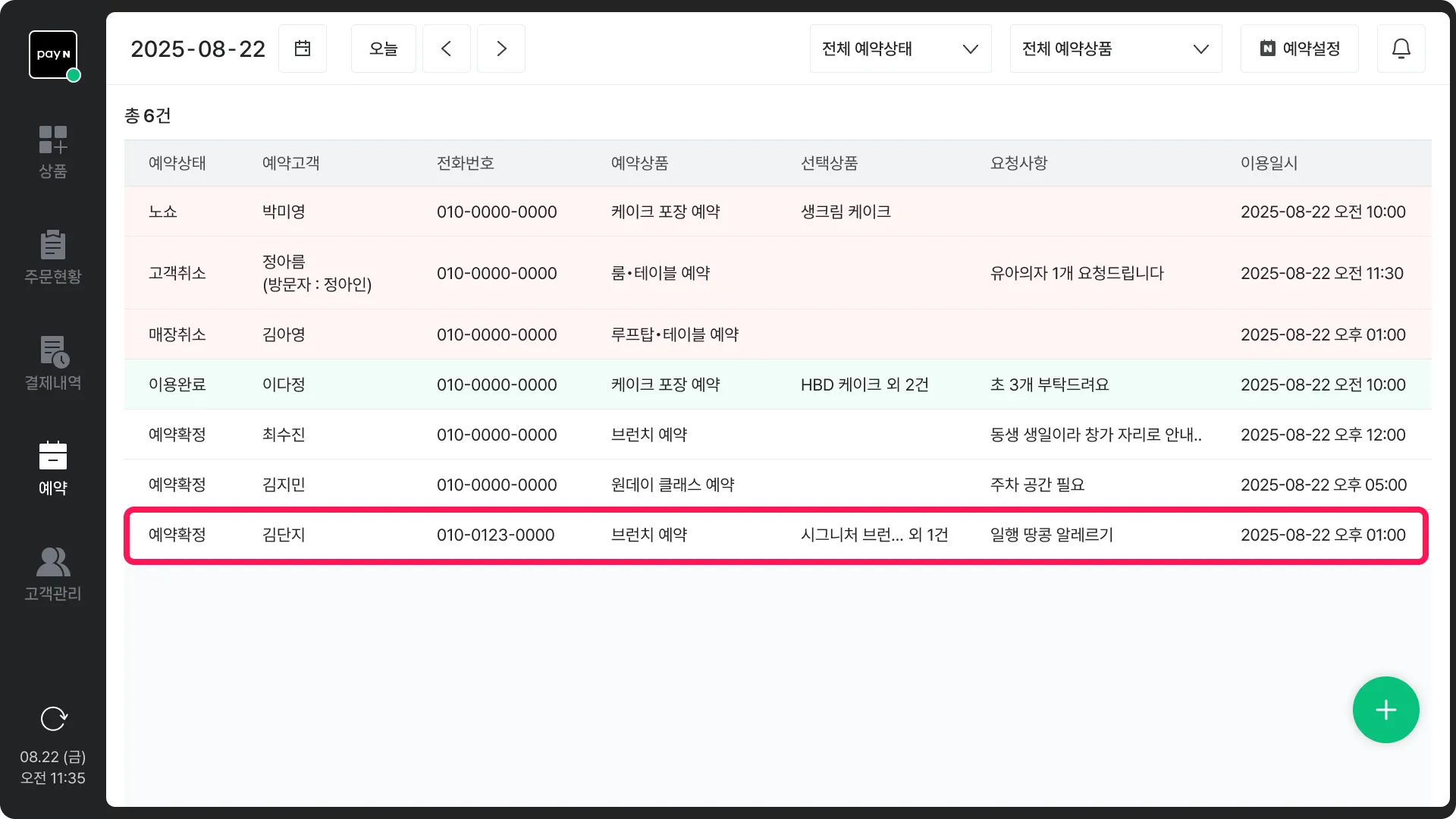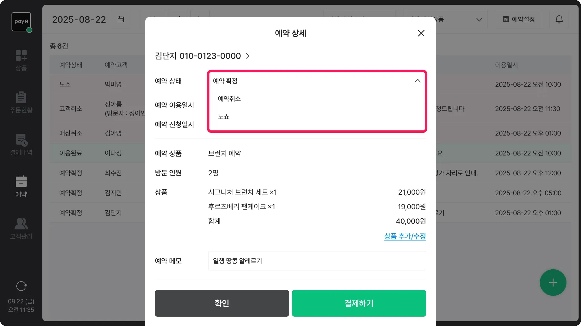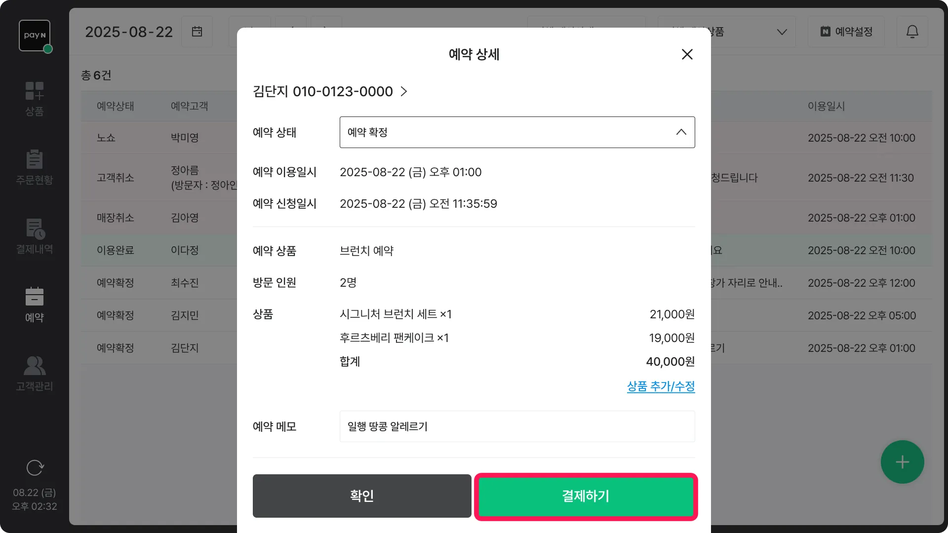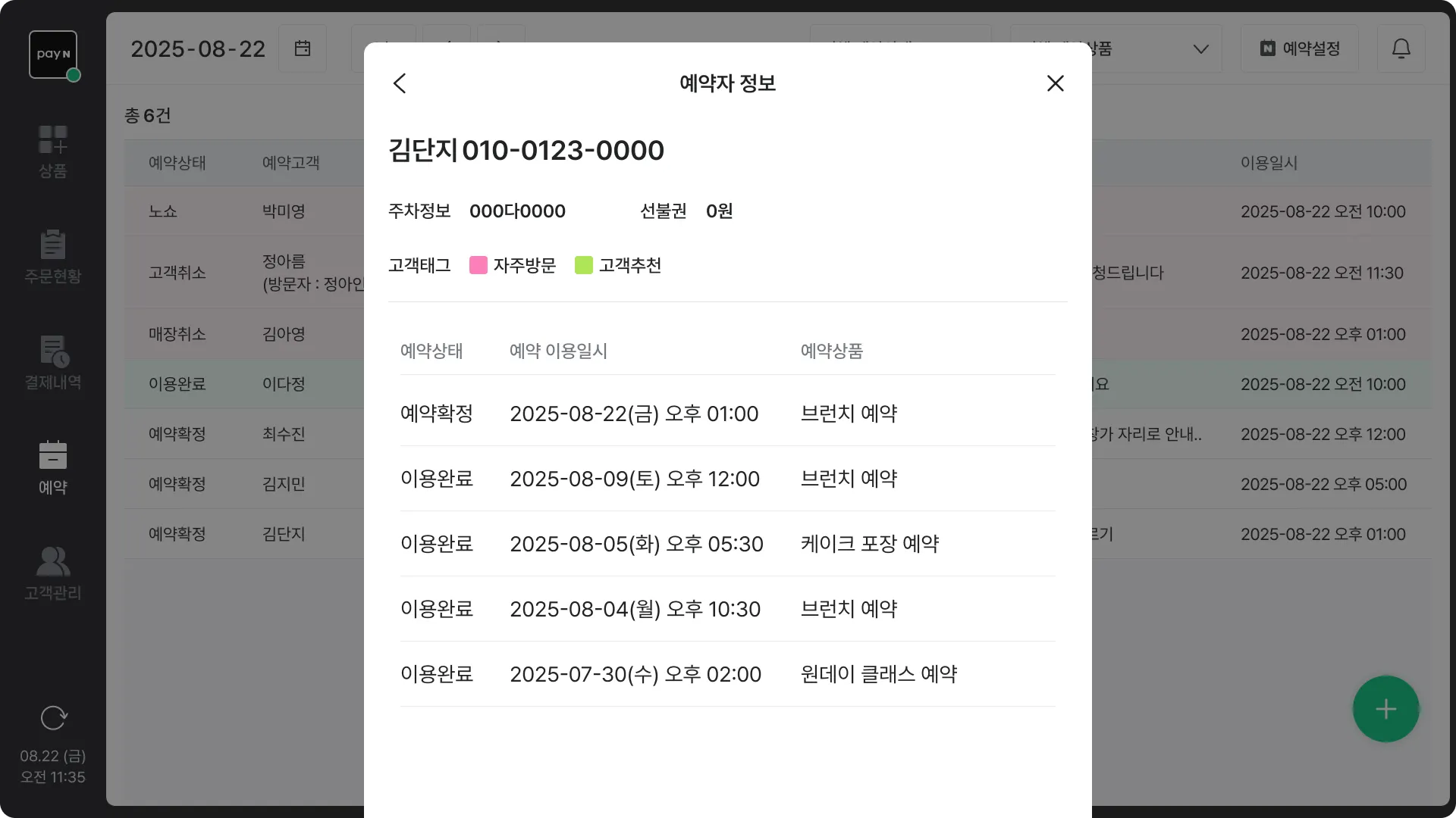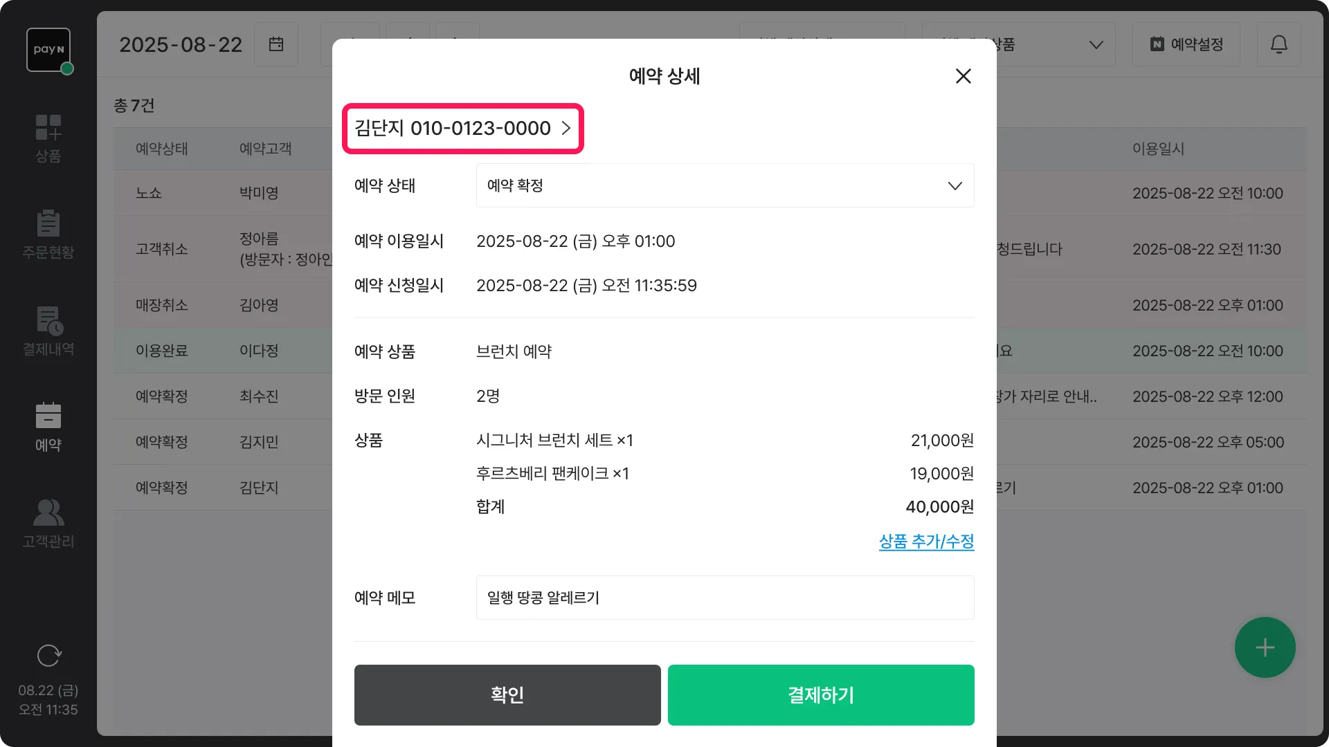예약 상세에서 해당 영역을 누르면 고객 정보 및 예약 내역을 확인할 수 있어요.예약 취소