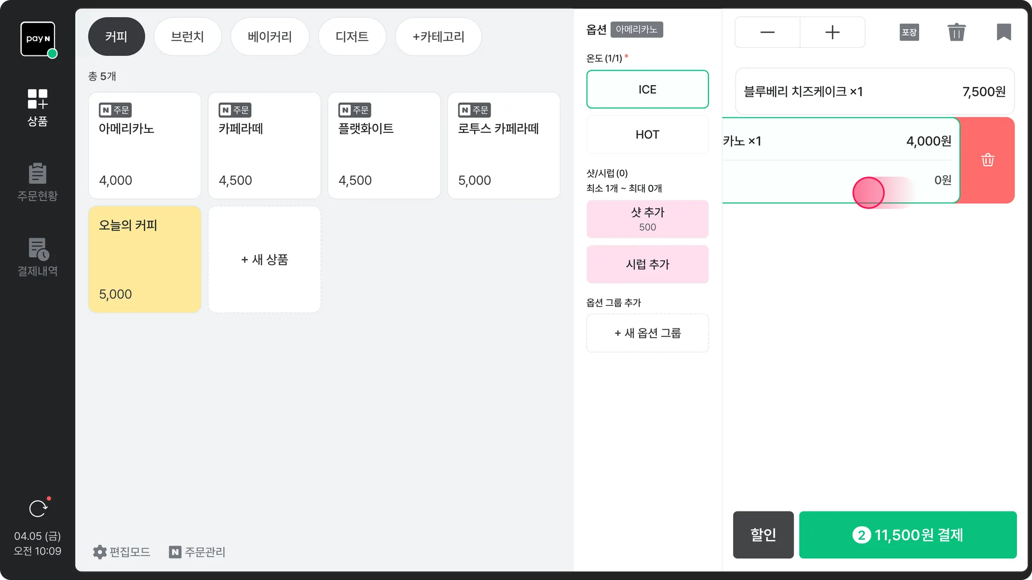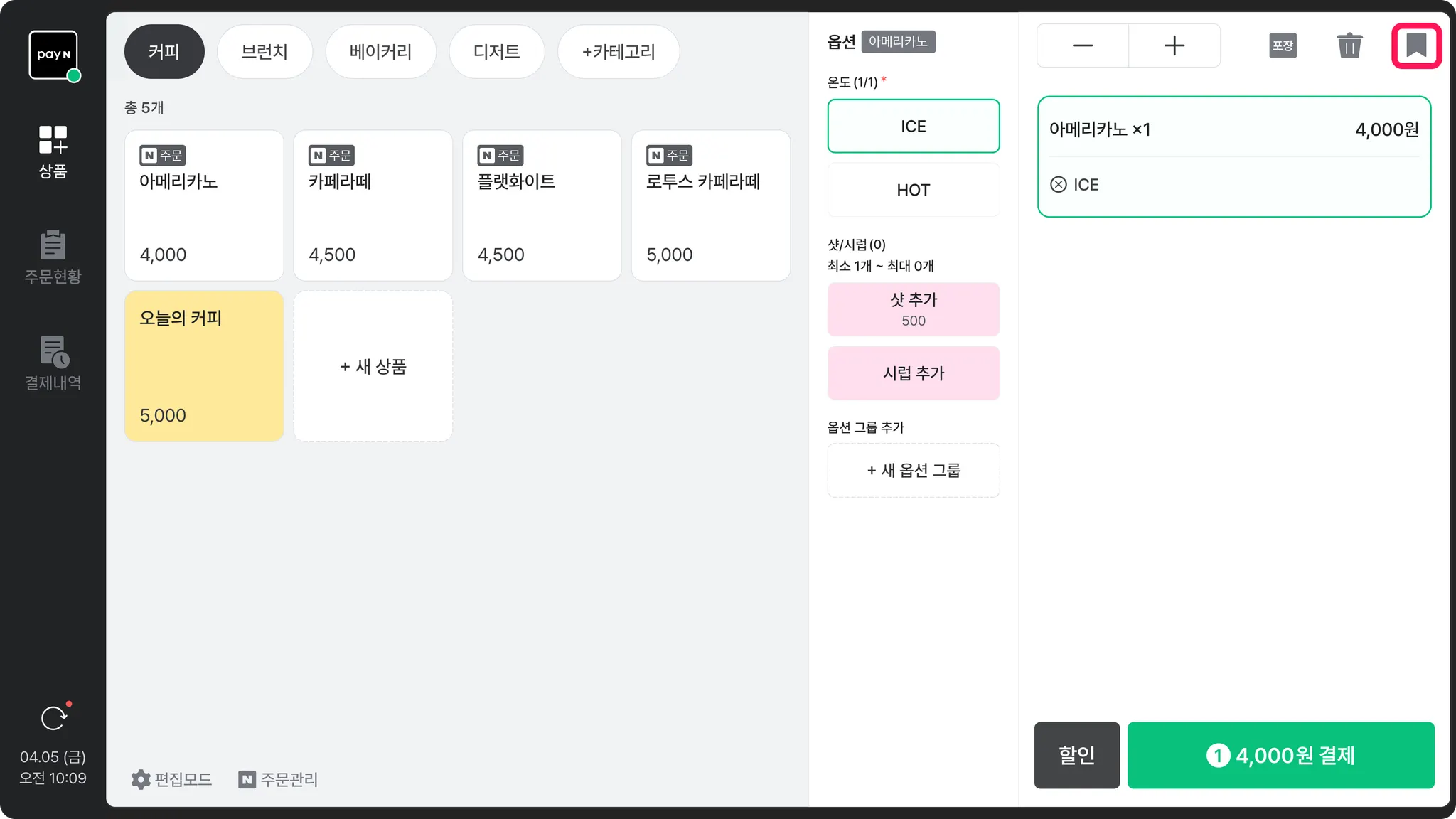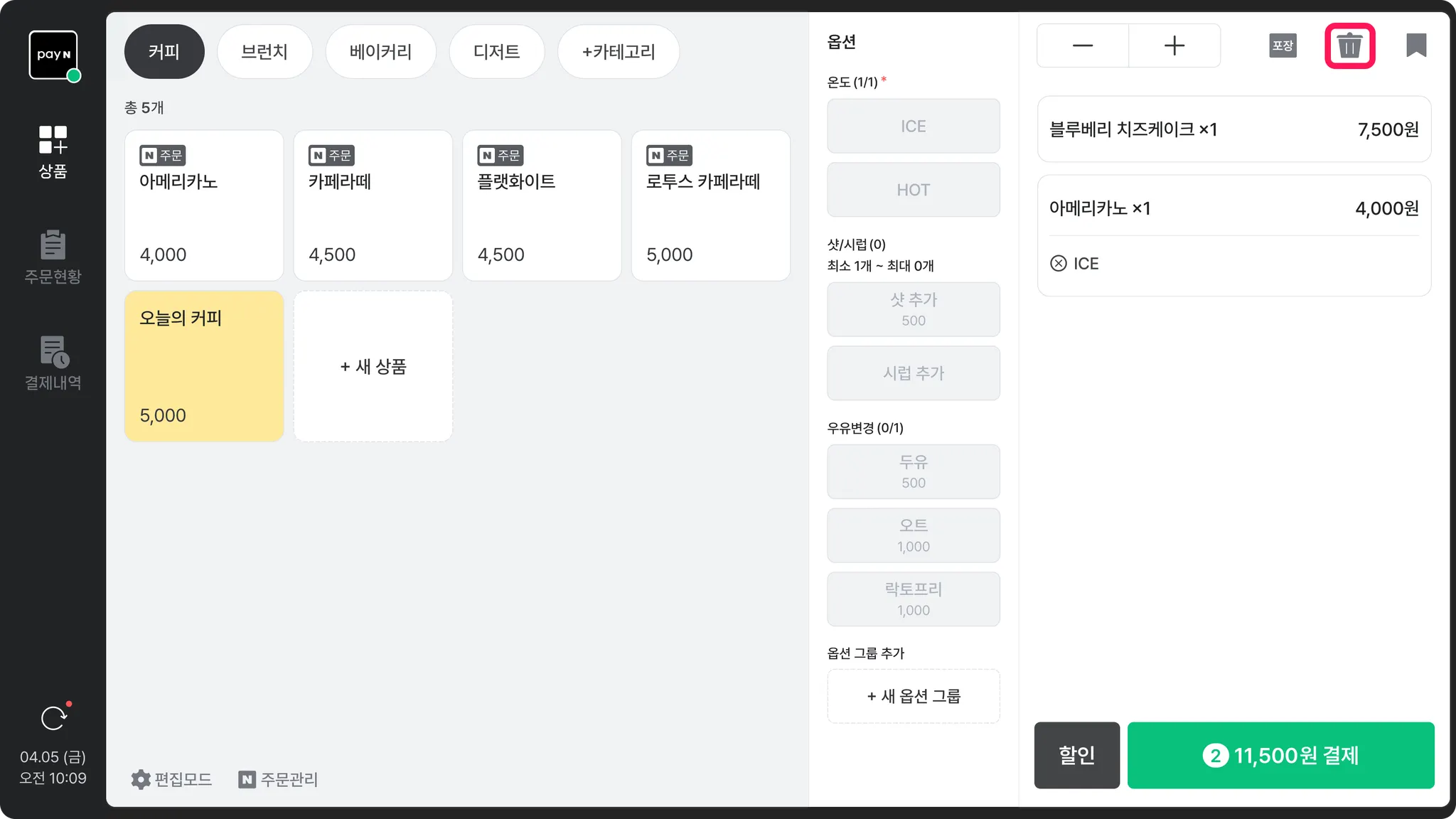 아이콘을 누르는 즉시 저장되고, 현재 주문서가 비워져요.