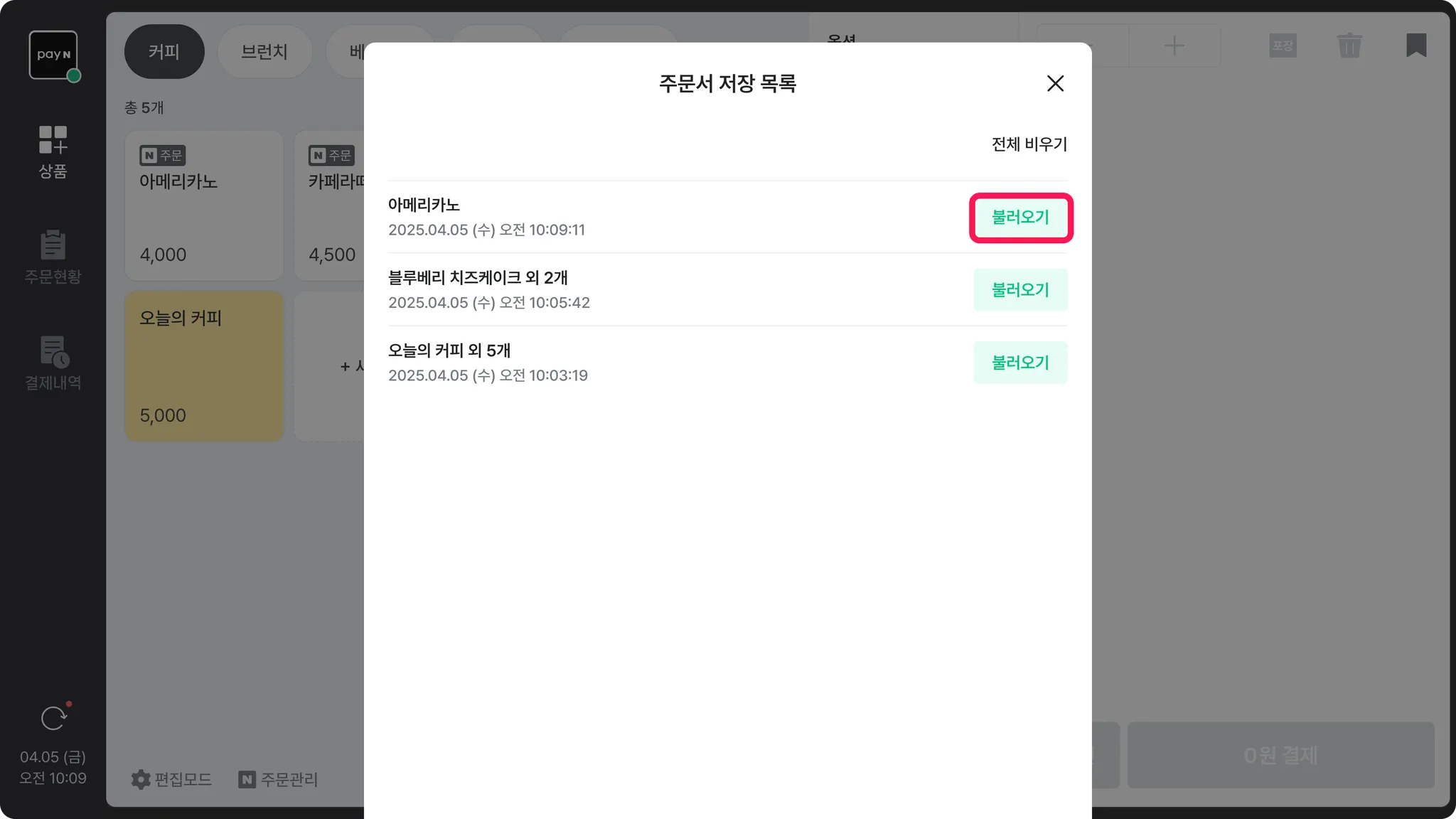 [] > [불러오기] 버튼을 누르면 주문서 저장 목록에서 대기 중인 주문서를 불러올 수 있어요.