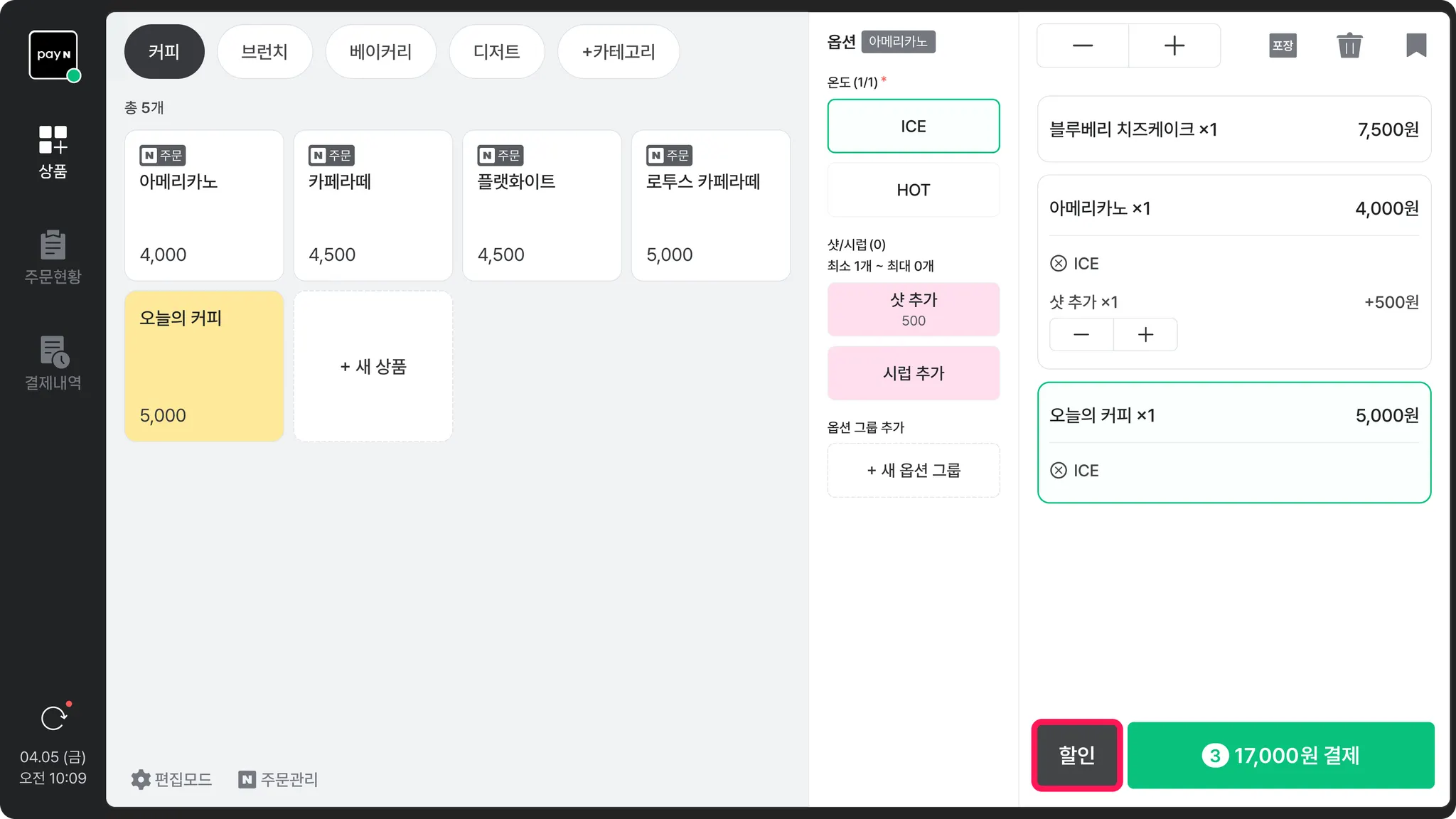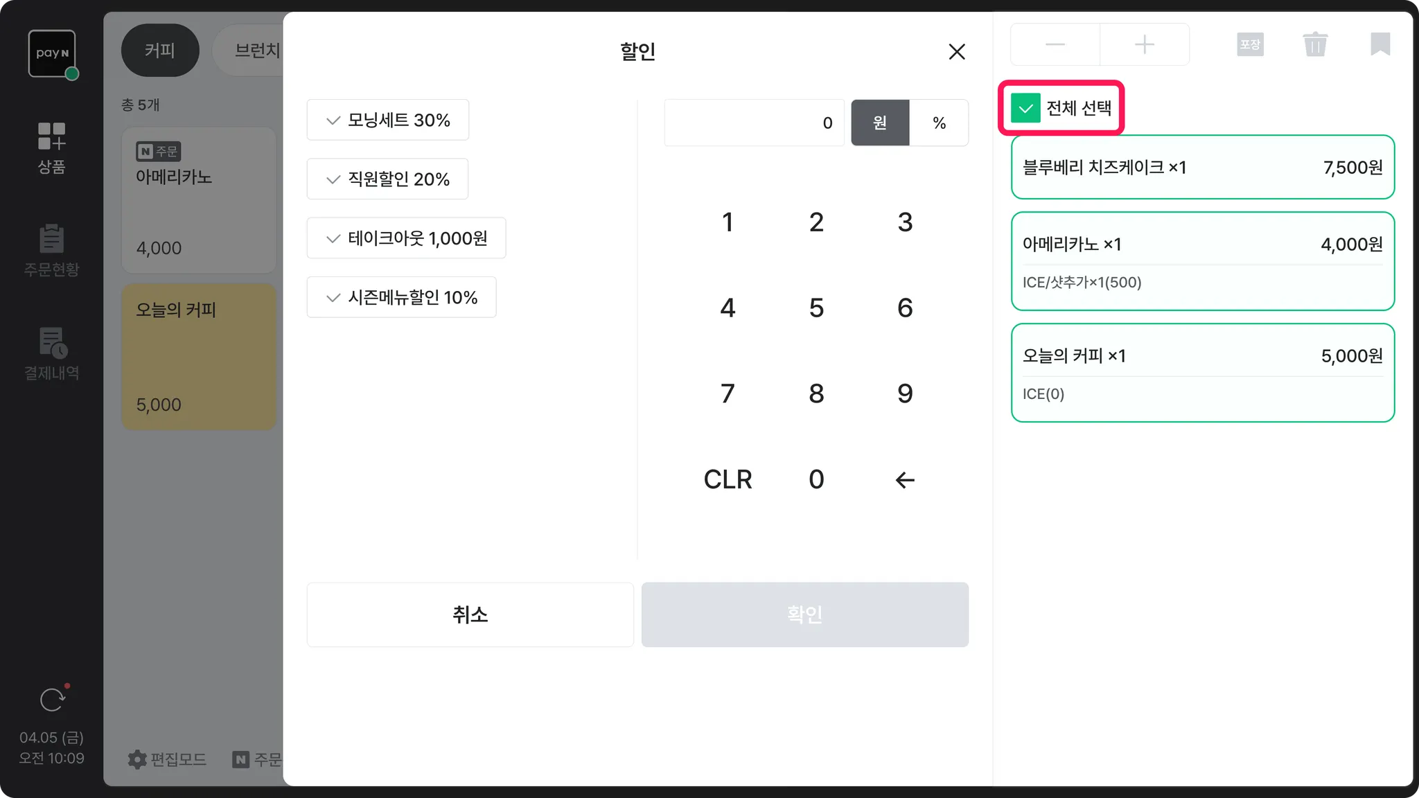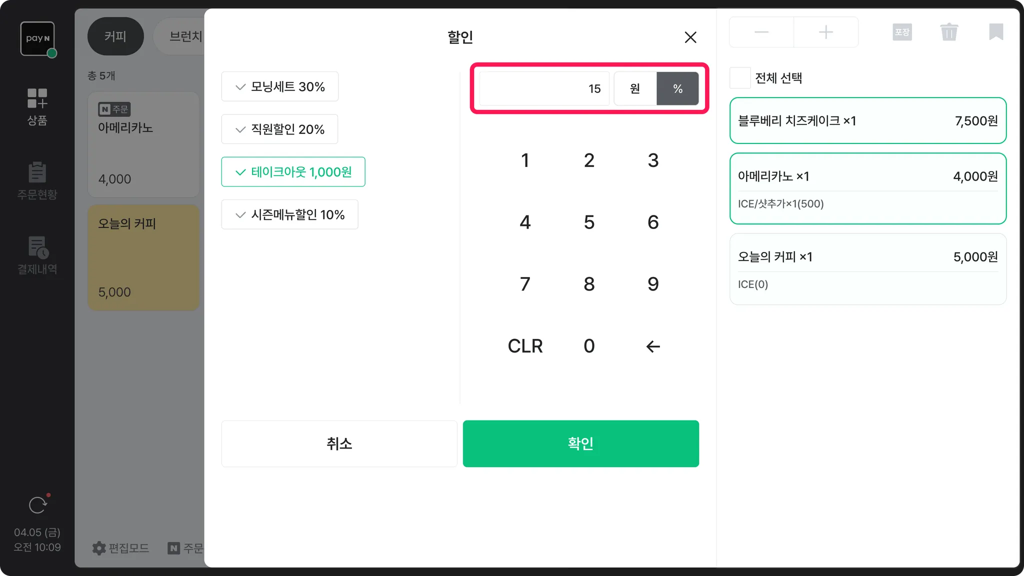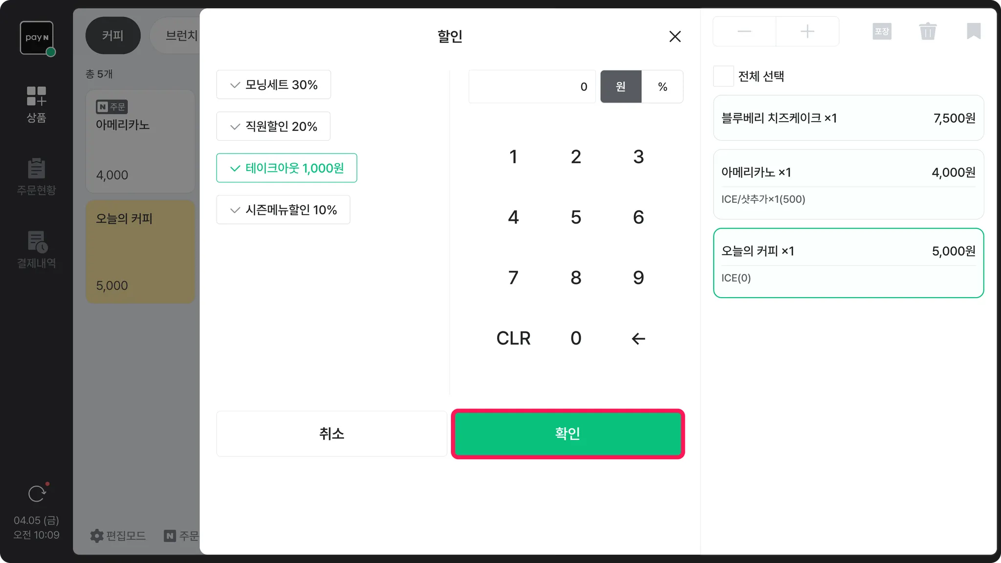 결제 단계로 넘어가기 전, 주문서에서 [할인] 버튼을 누르면 할인을 적용할 수 있어요.