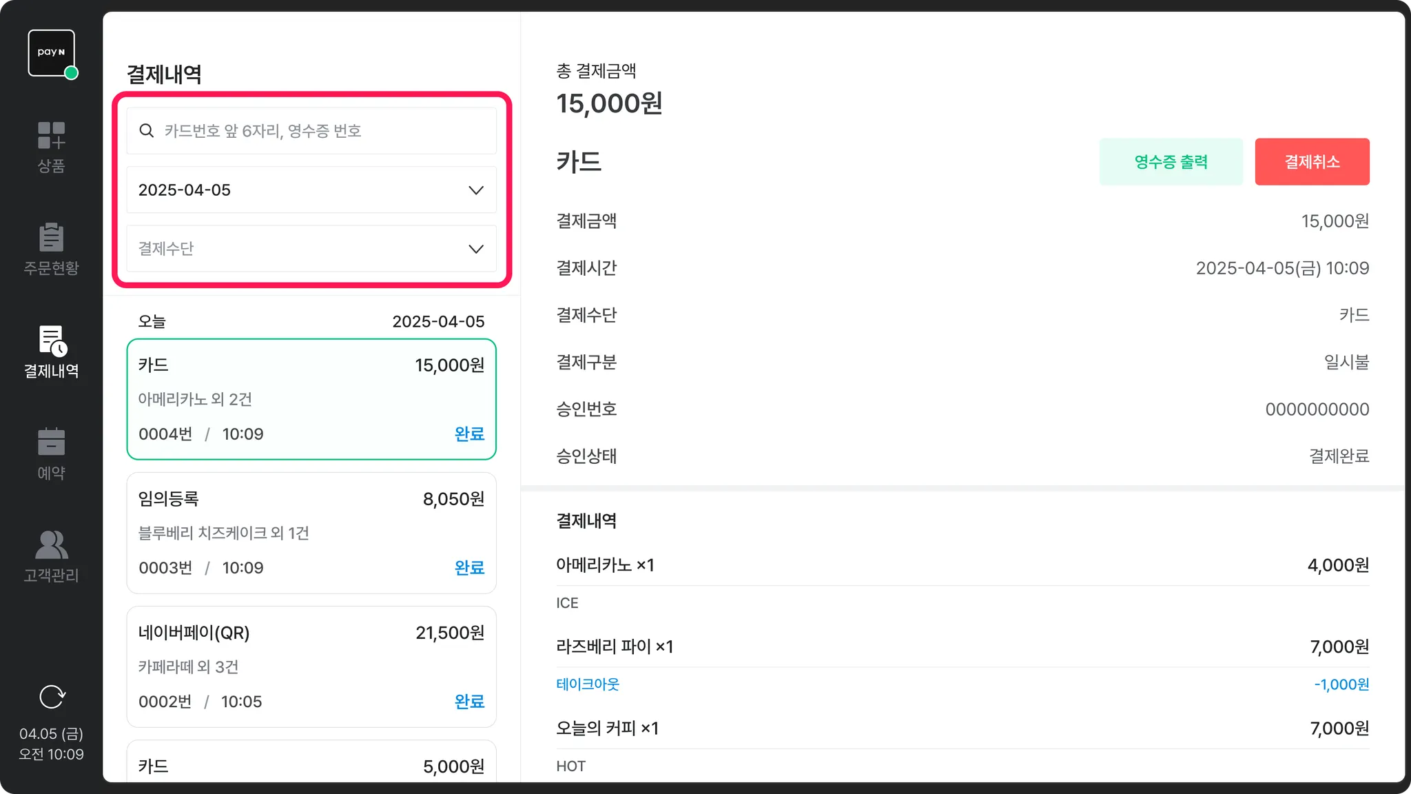 목록에서 원하는 결제내역을 선택하면 상세 정보를 확인할 수 있어요.영수증 추가 출력