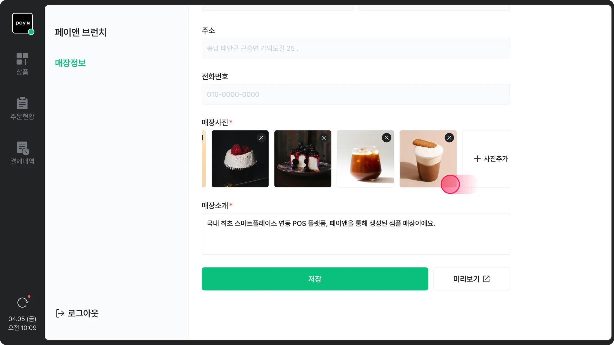 매장 사진 및 매장 소개를 설정한 후, [저장]을 눌러주세요.•