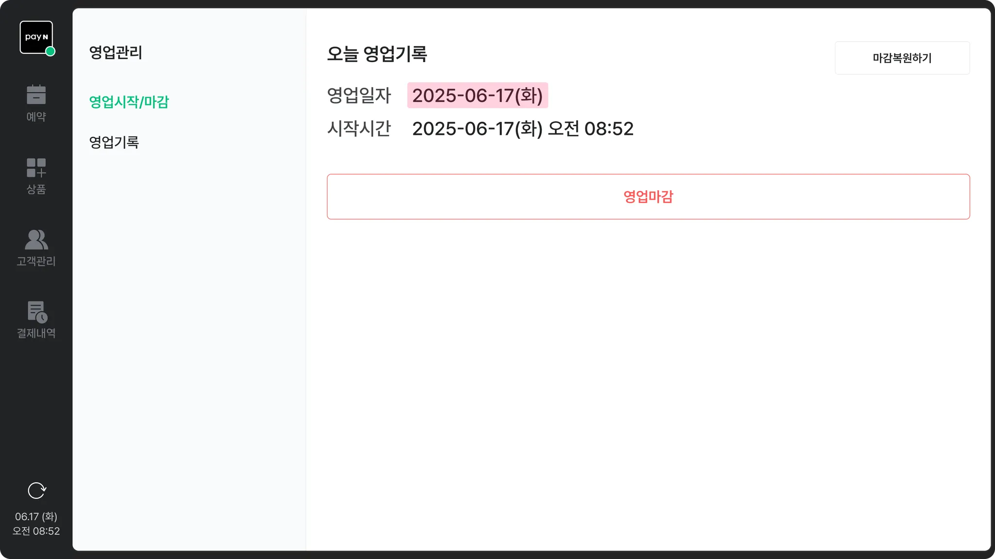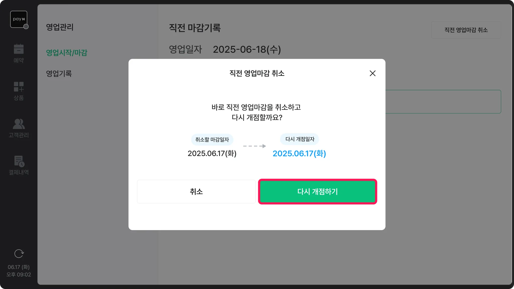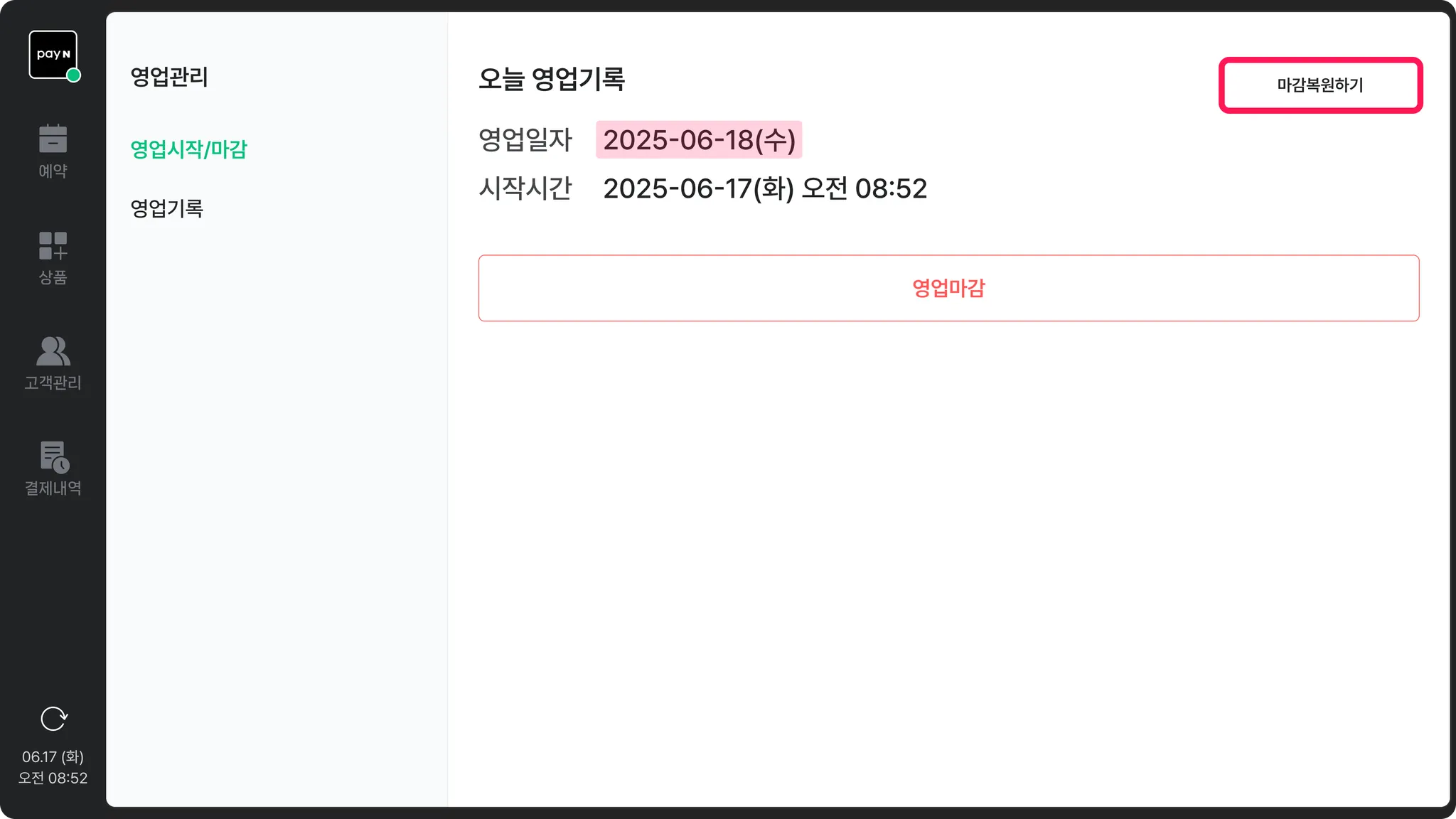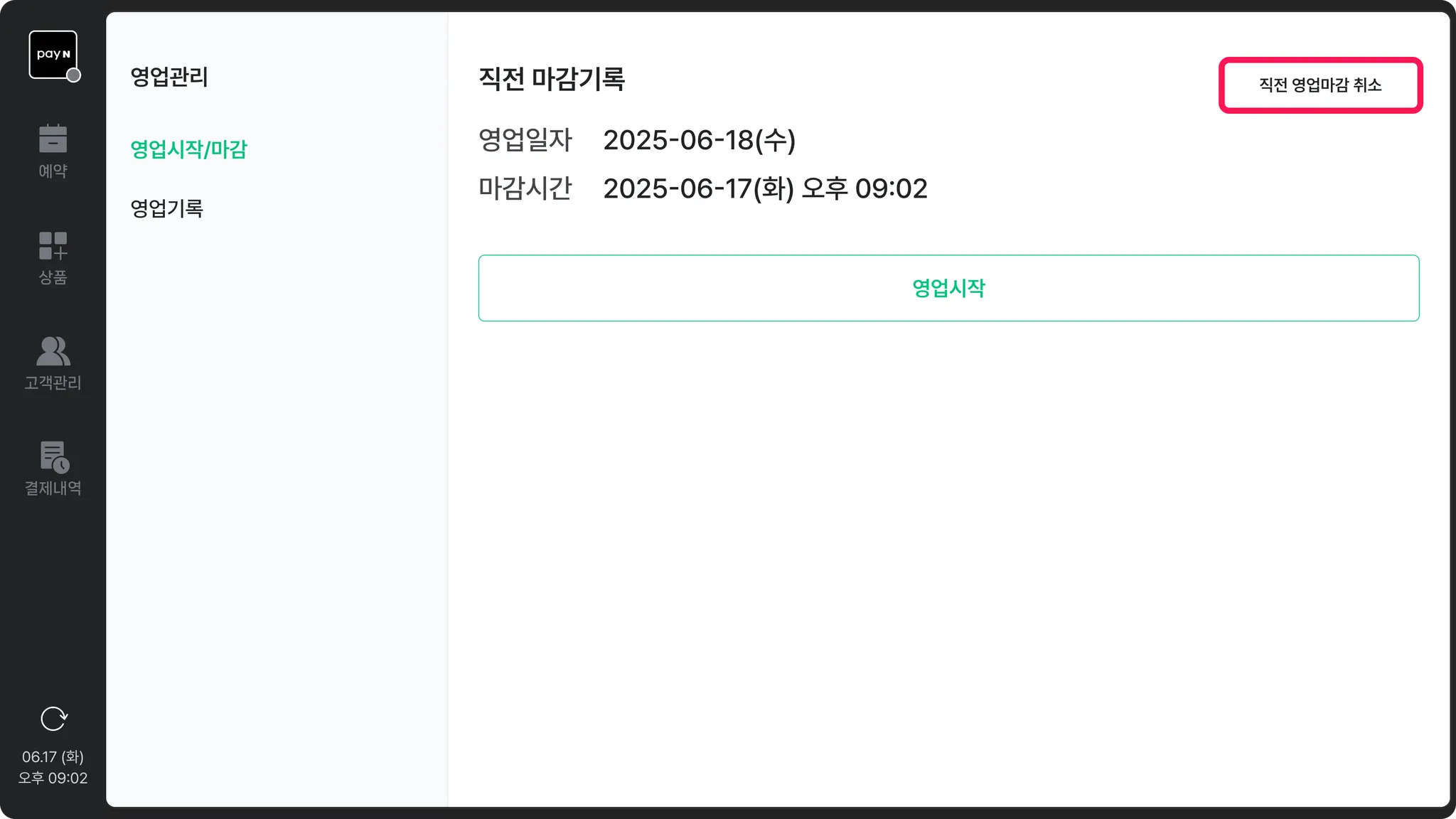 ex) 영업일자 : 2025-06-18(수) → 2025-06-17(화) 영업마감 취소