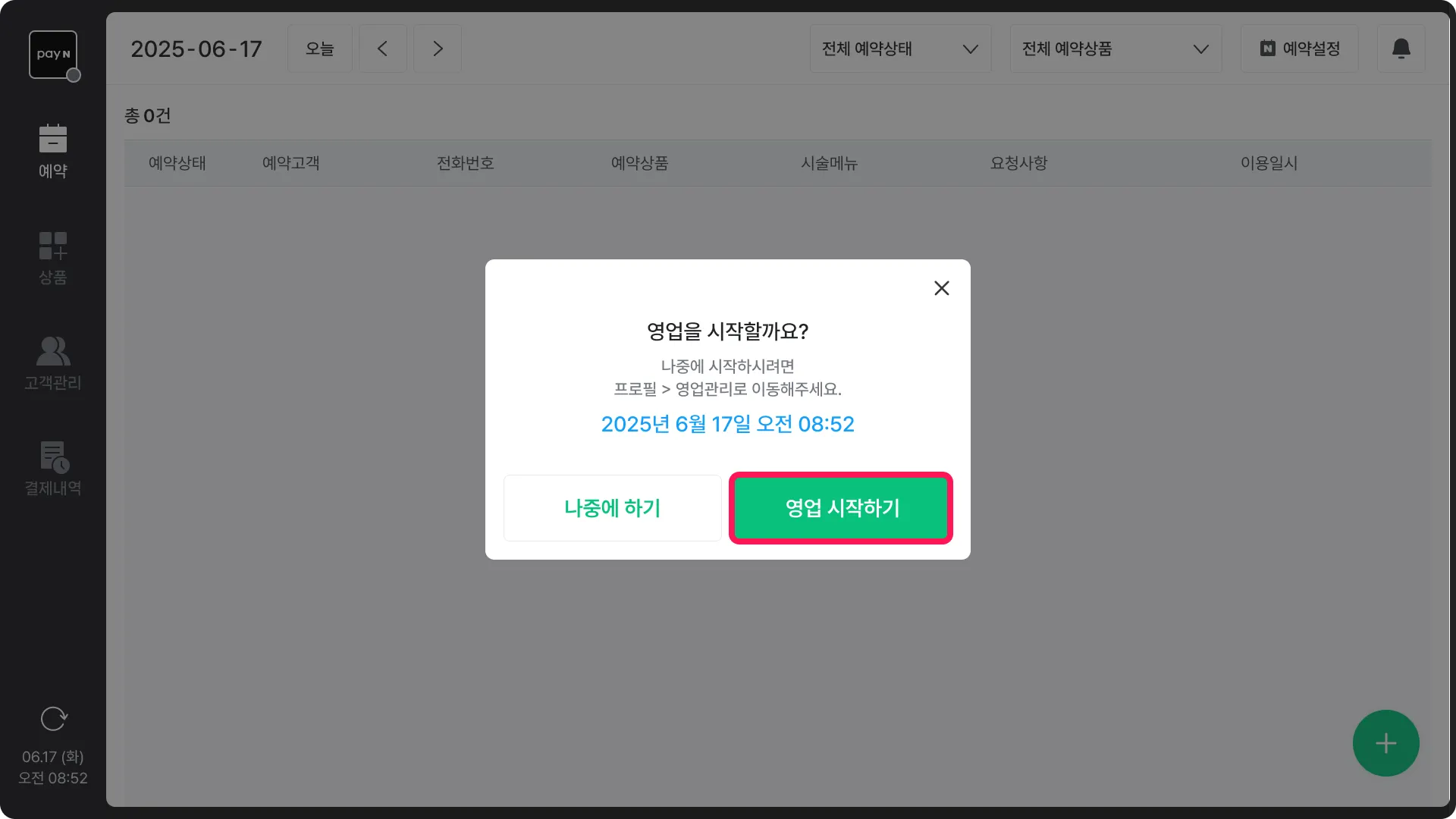 [영업시작] 버튼을 누르면 바로 영업이 시작돼요.