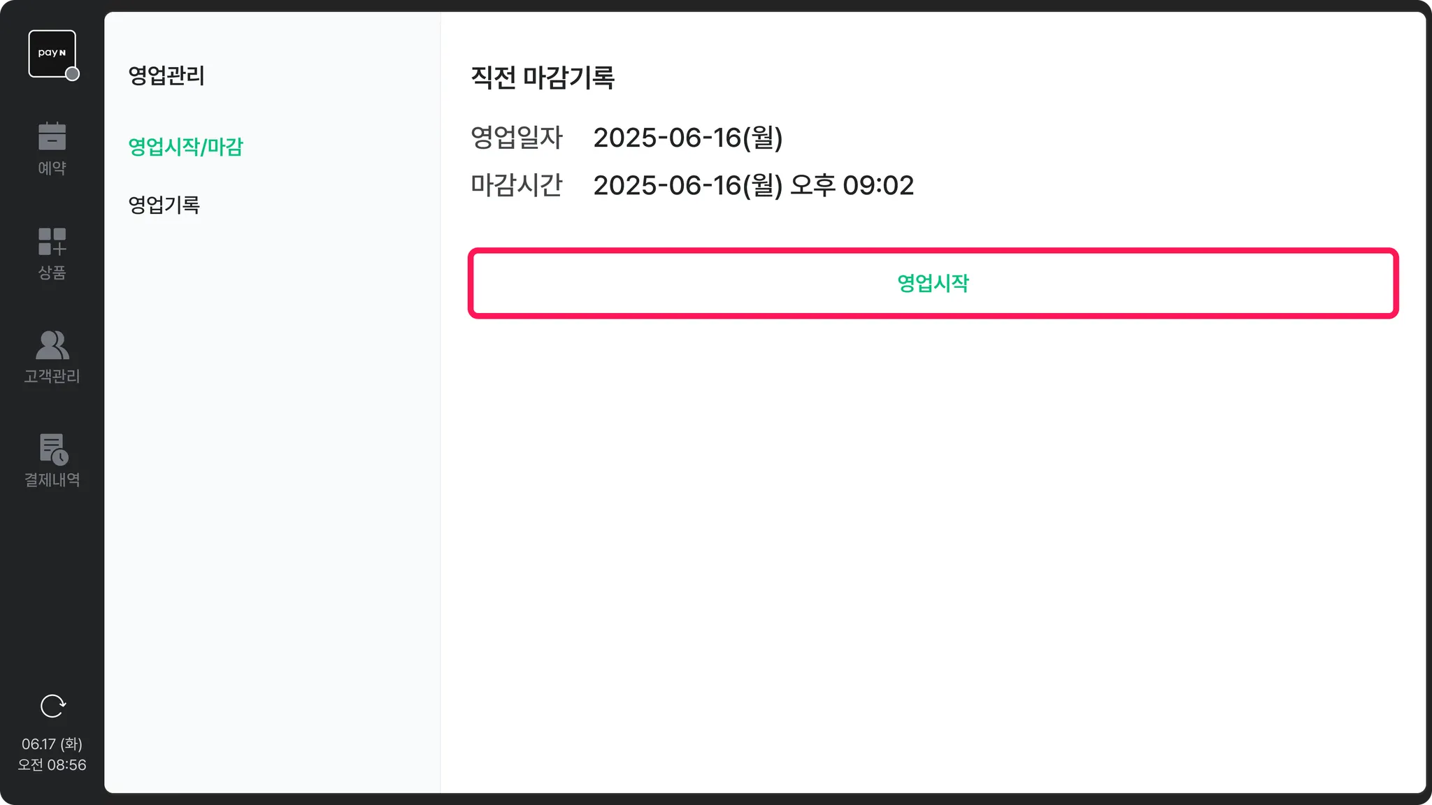 좌측 상단 [로고] > [영업관리]에서 [영업마감] 버튼을 눌러주세요.