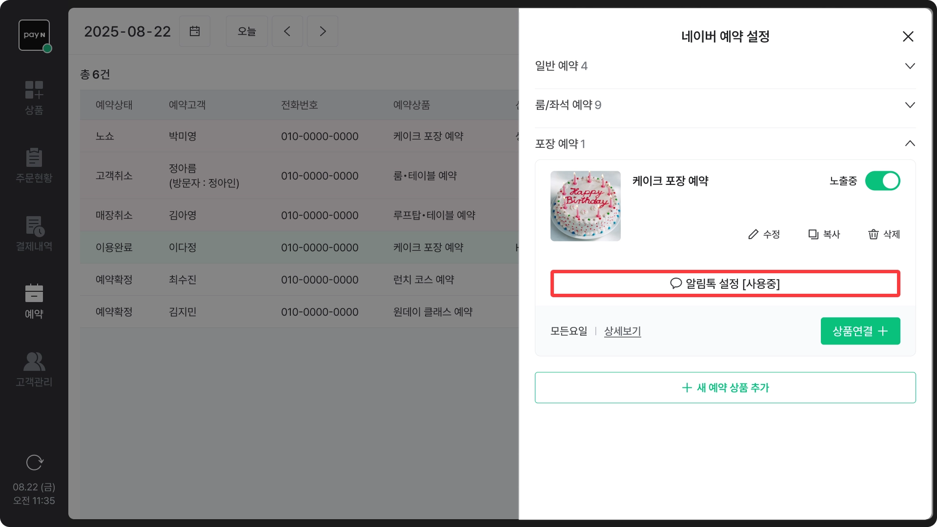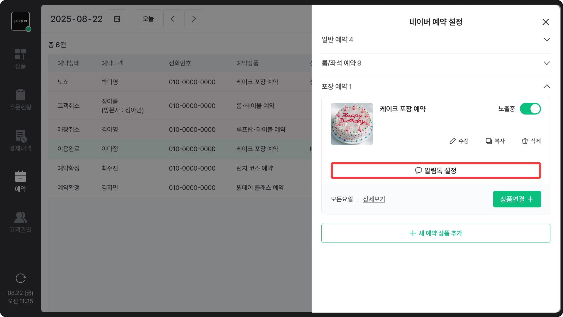 설정하실 예약 상품의 [알림톡 설정]을 눌러주세요.