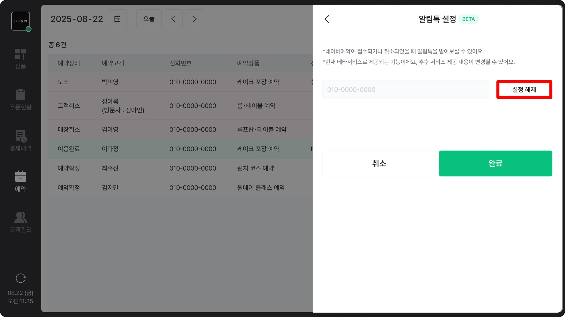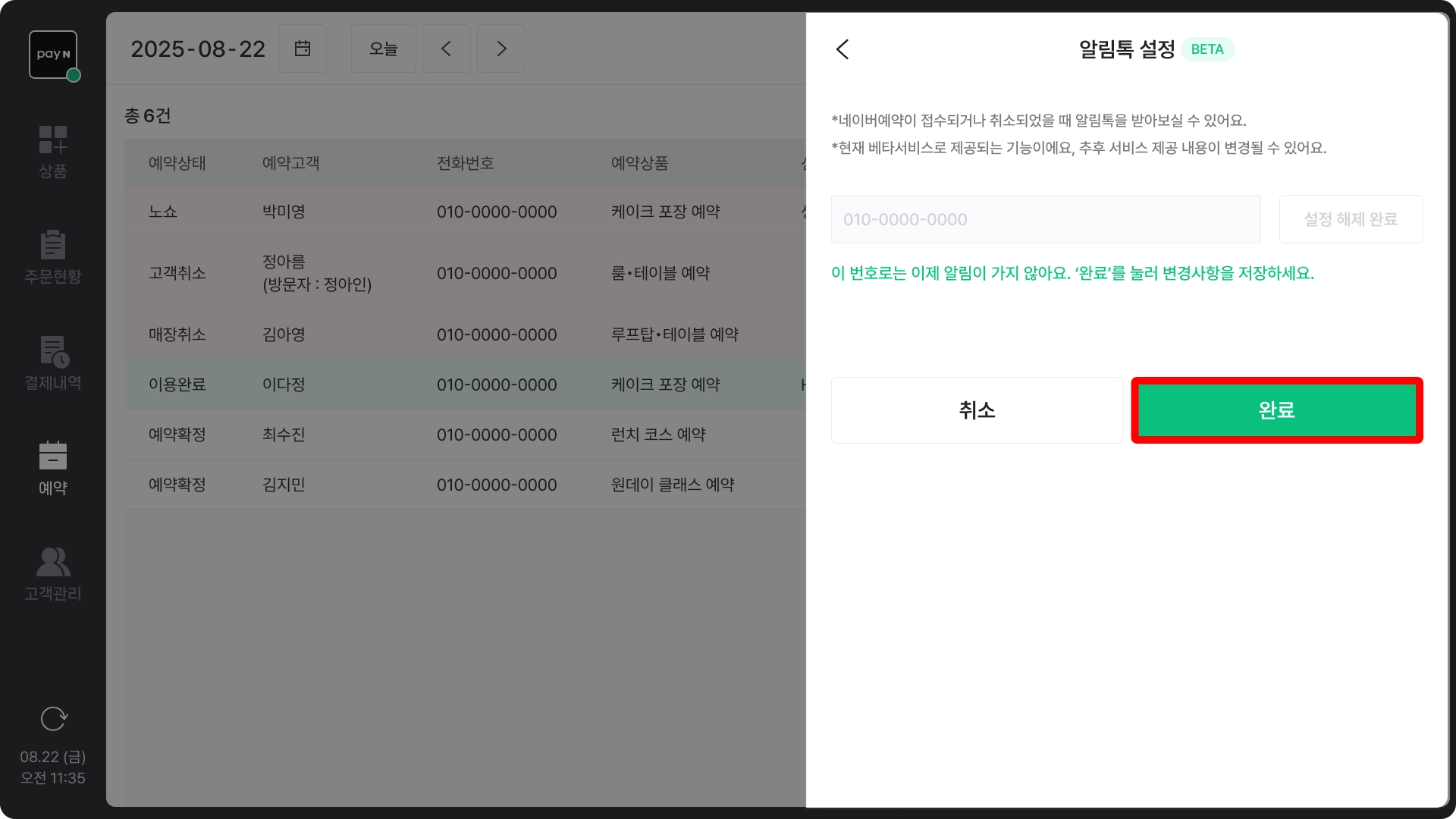 포스에서 직접 예약을 생성하거나 취소하신 경우에는 알림톡이 발송되지 않아요.