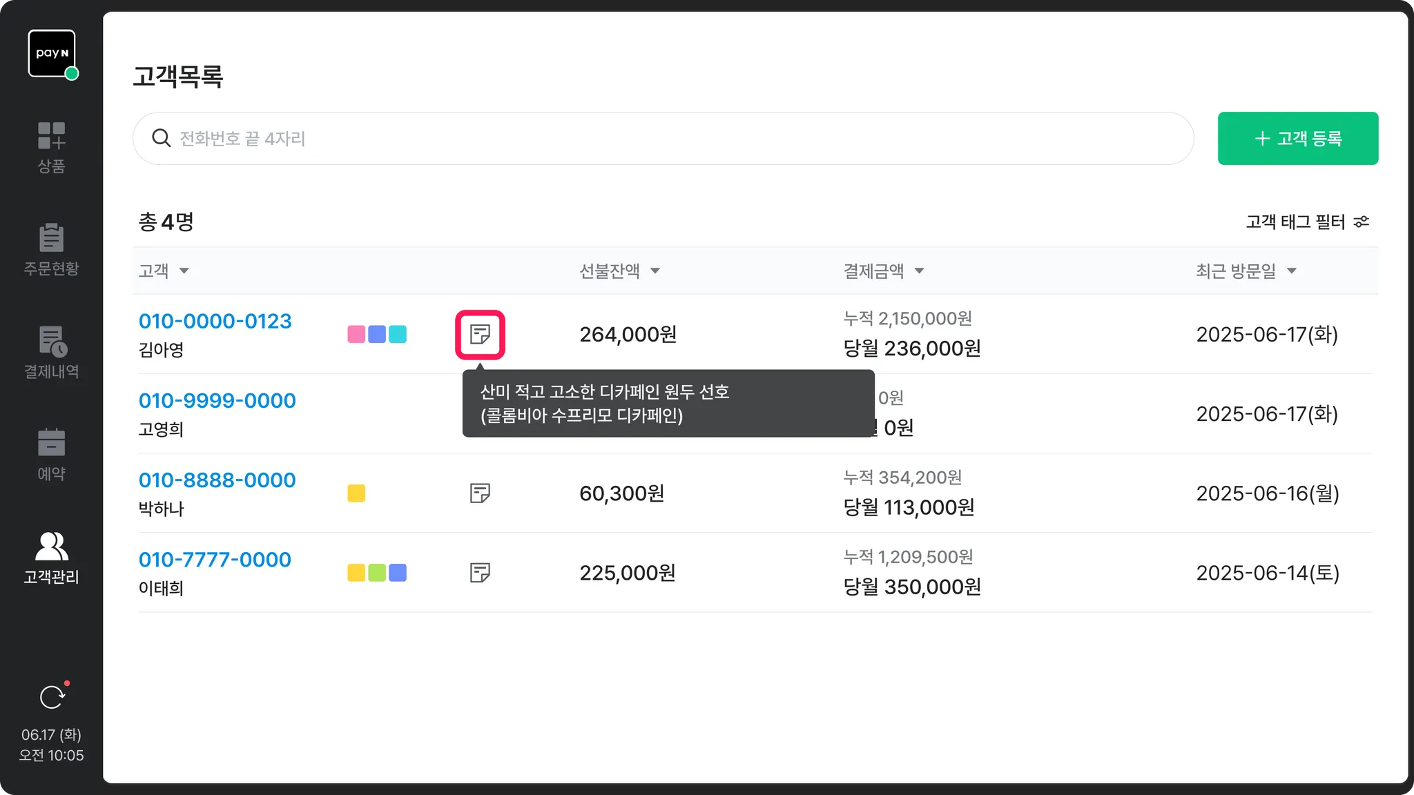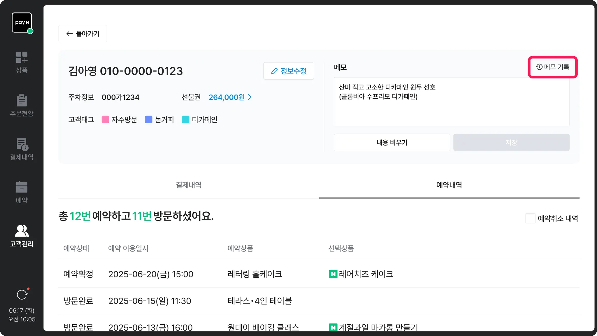 특이사항을 메모할 고객의 전화번호 또는 이름을 눌러주세요.