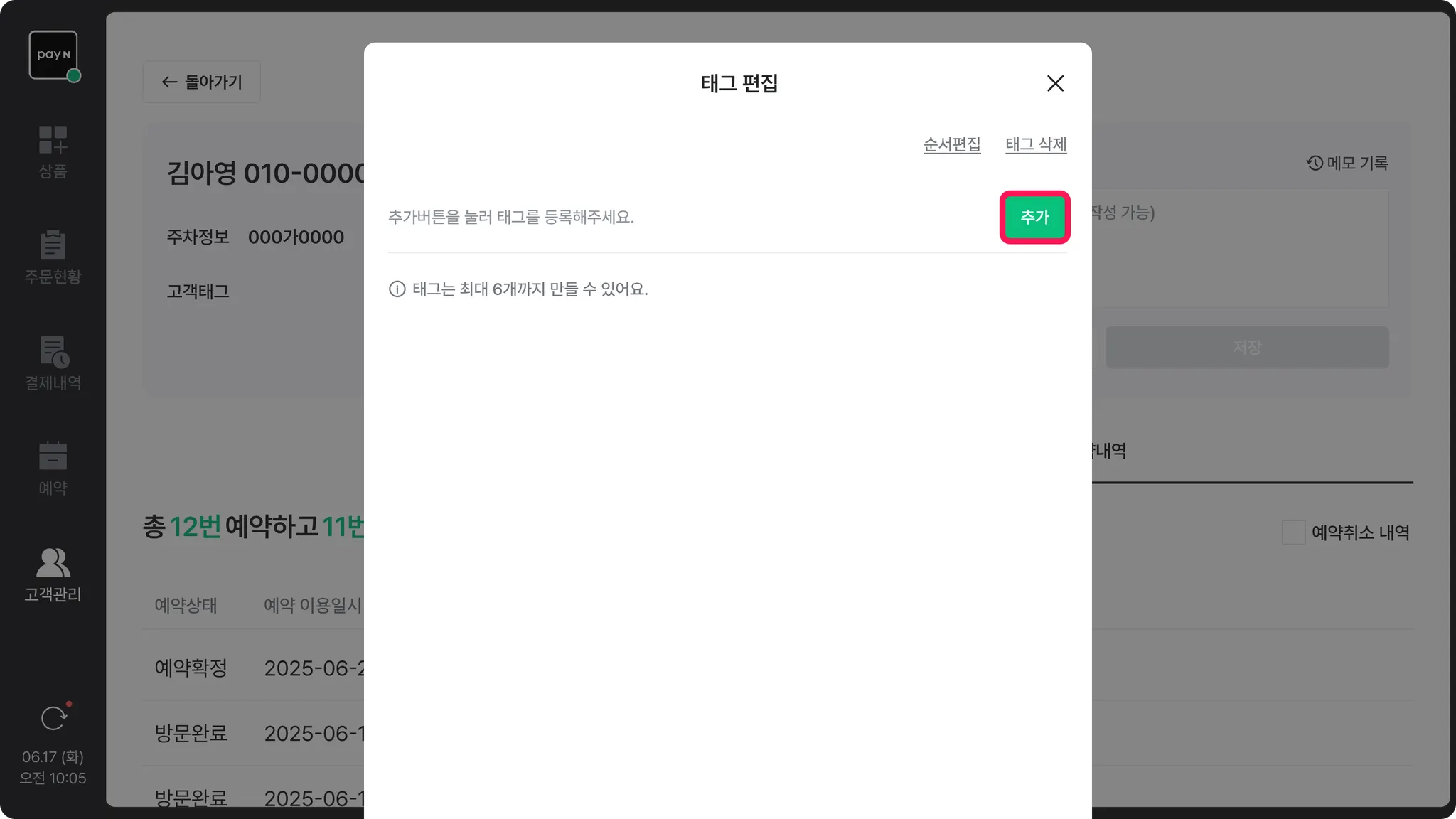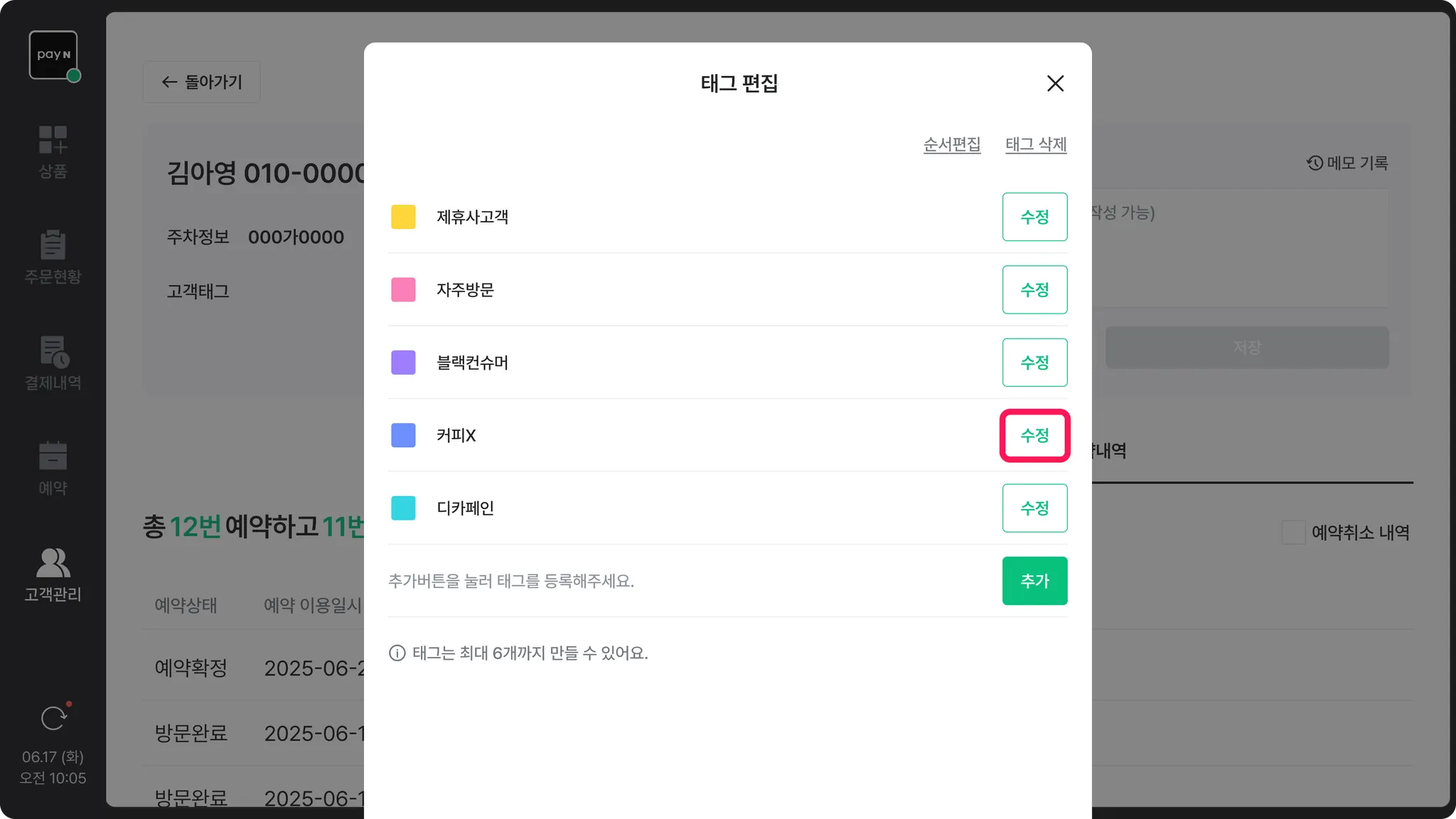 고객태그 하단 [태그편집]을 누르면 등록/수정/순서 편집을 할 수 있어요.•