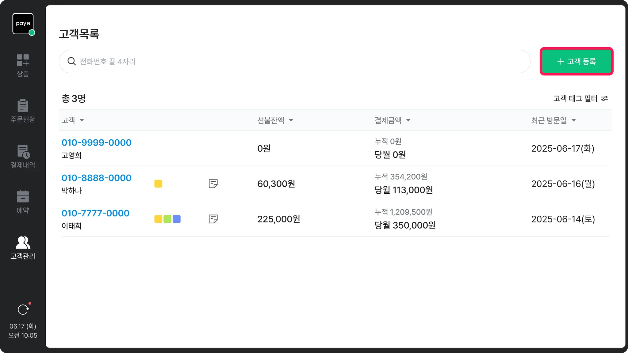 포스에서 고객을 등록하려면, [고객 관리] > [+고객 등록]을 눌러주세요.