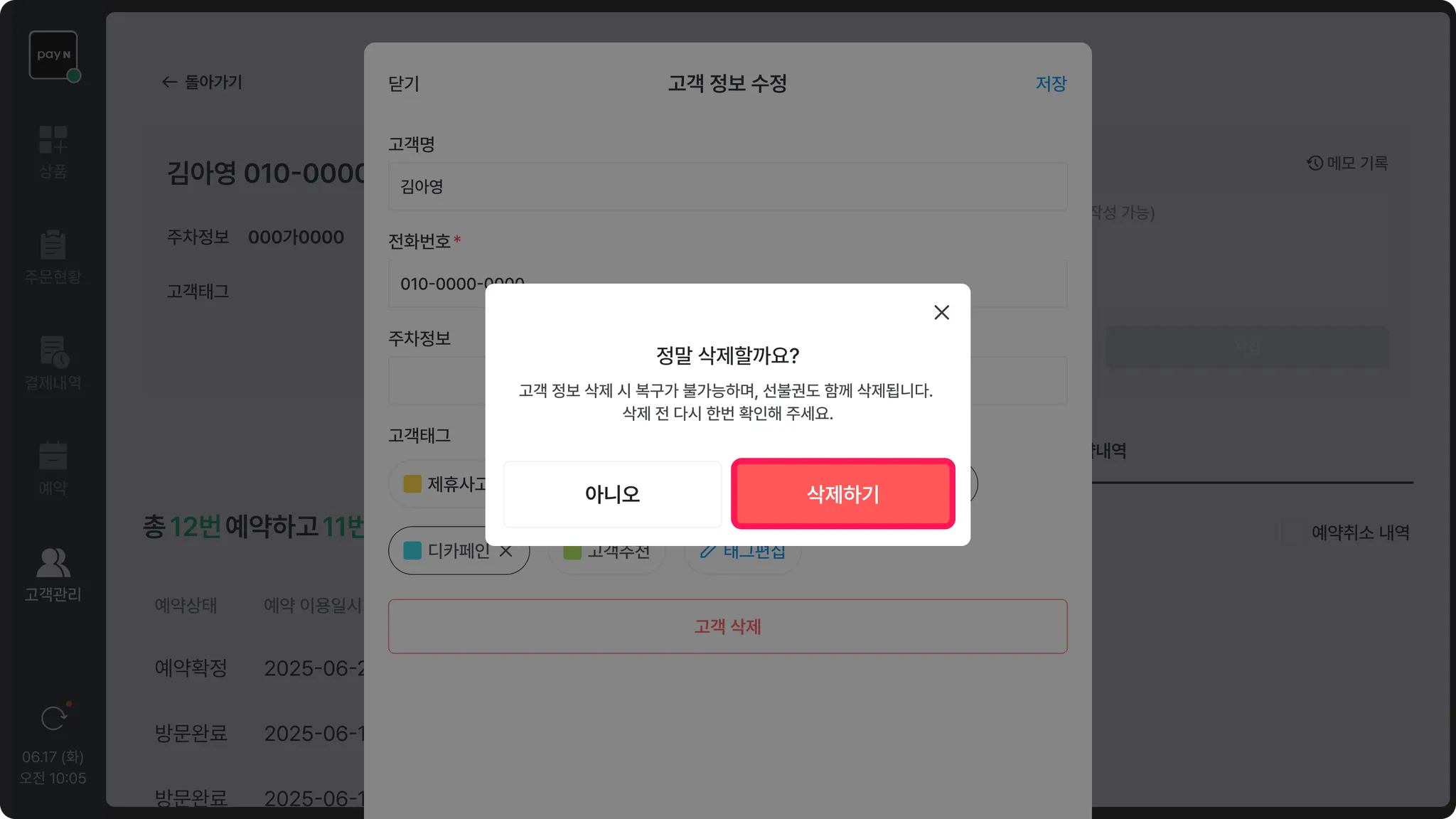 고객 정보와 선불권은 복구가 불가하니 신중히 삭제해주세요.고객 태그