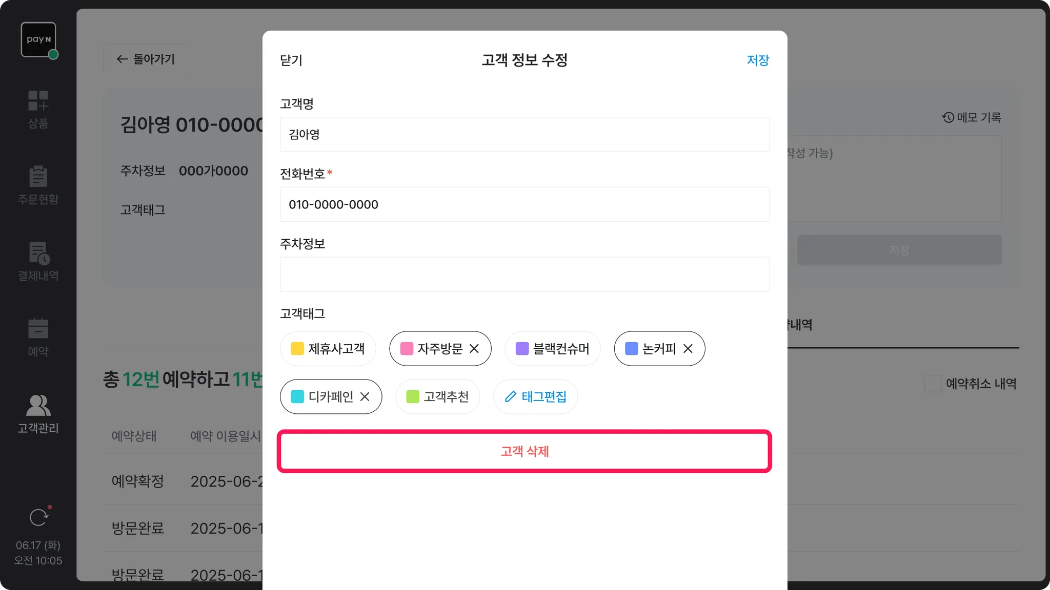 삭제가 필요한 경우, [고객 삭제]를 눌러주세요.