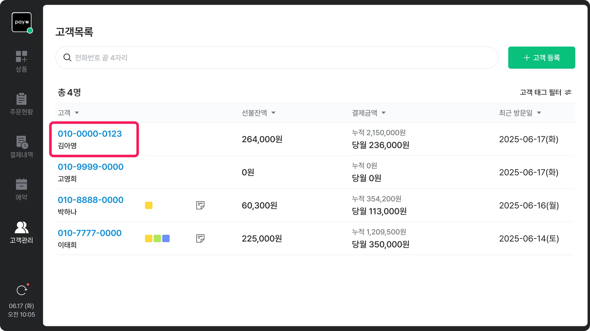 결제/예약내역을 확인할 고객의 전화번호 또는 이름을 눌러주세요.