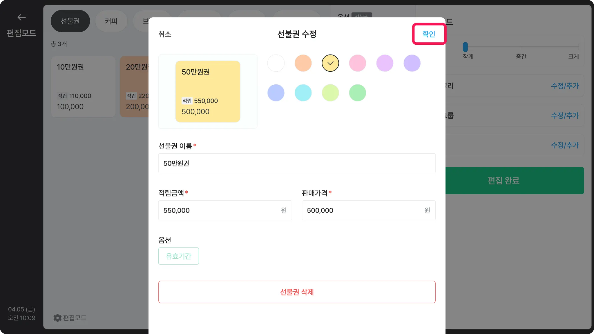 수정을 마친 후, [확인]을 눌러주세요. ex) 30만원권 → 50만원권