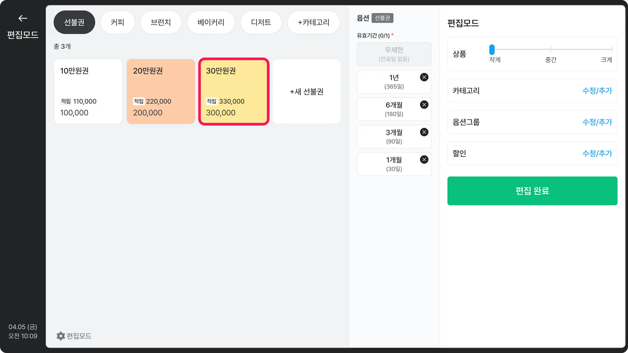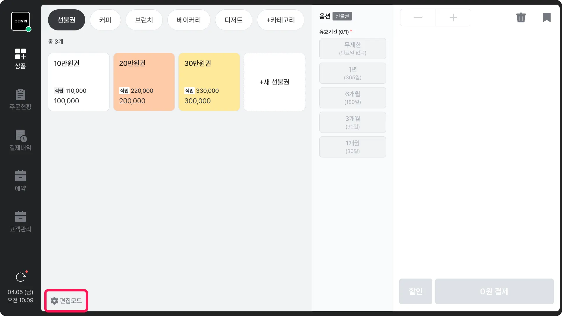 편집모드]를 누른 후, 수정할 선불권을 선택해 주세요.
