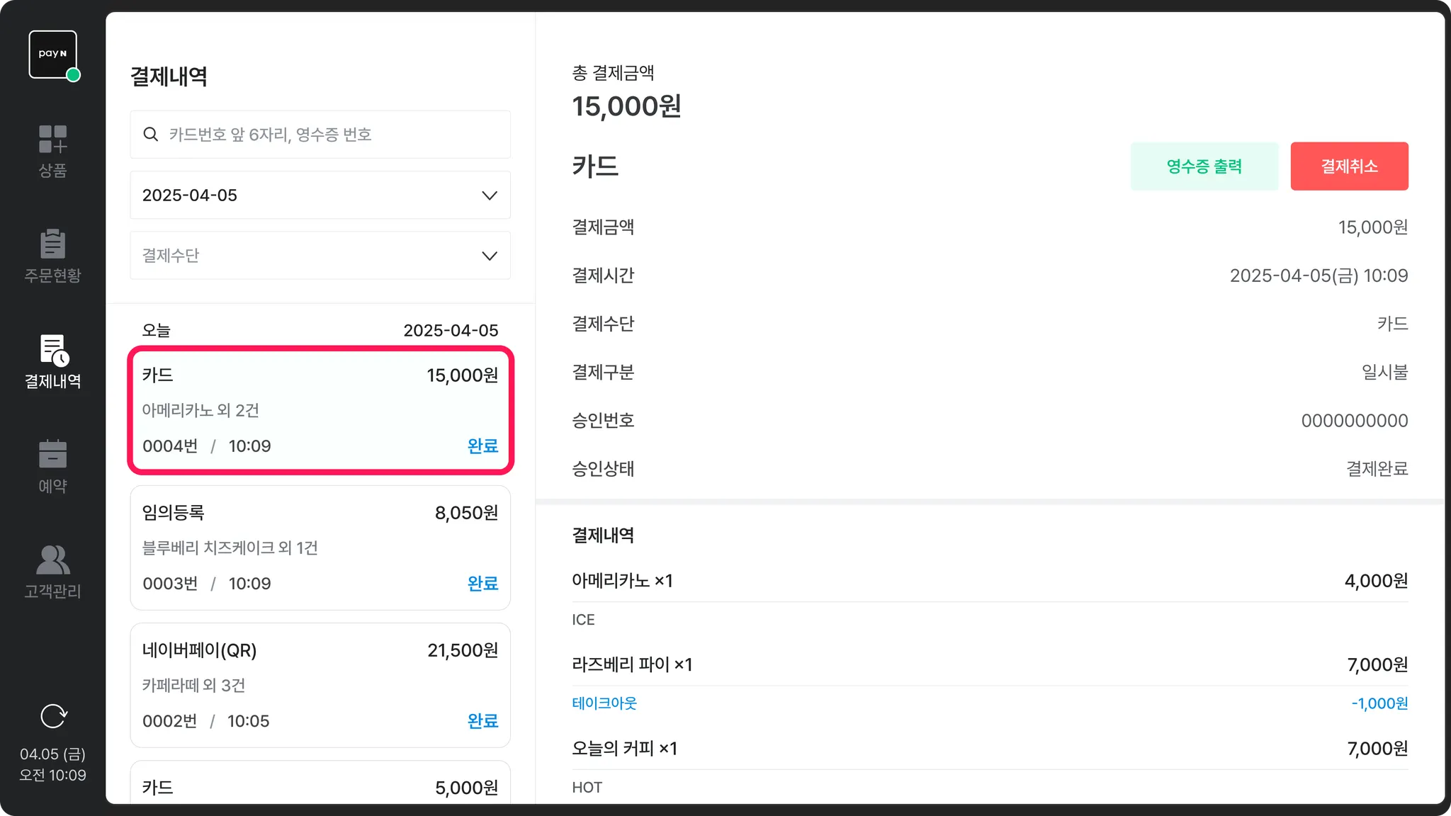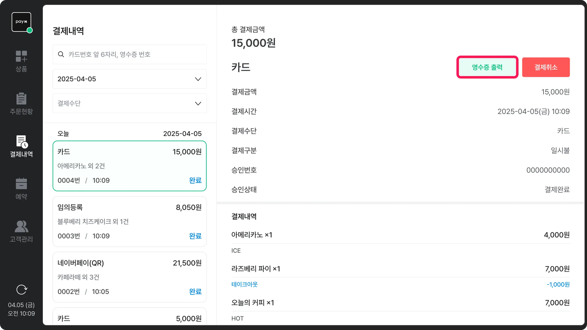 목록에서 원하는 결제내역을 선택하면 상세 정보를 확인할 수 있어요.영수증 추가 출력