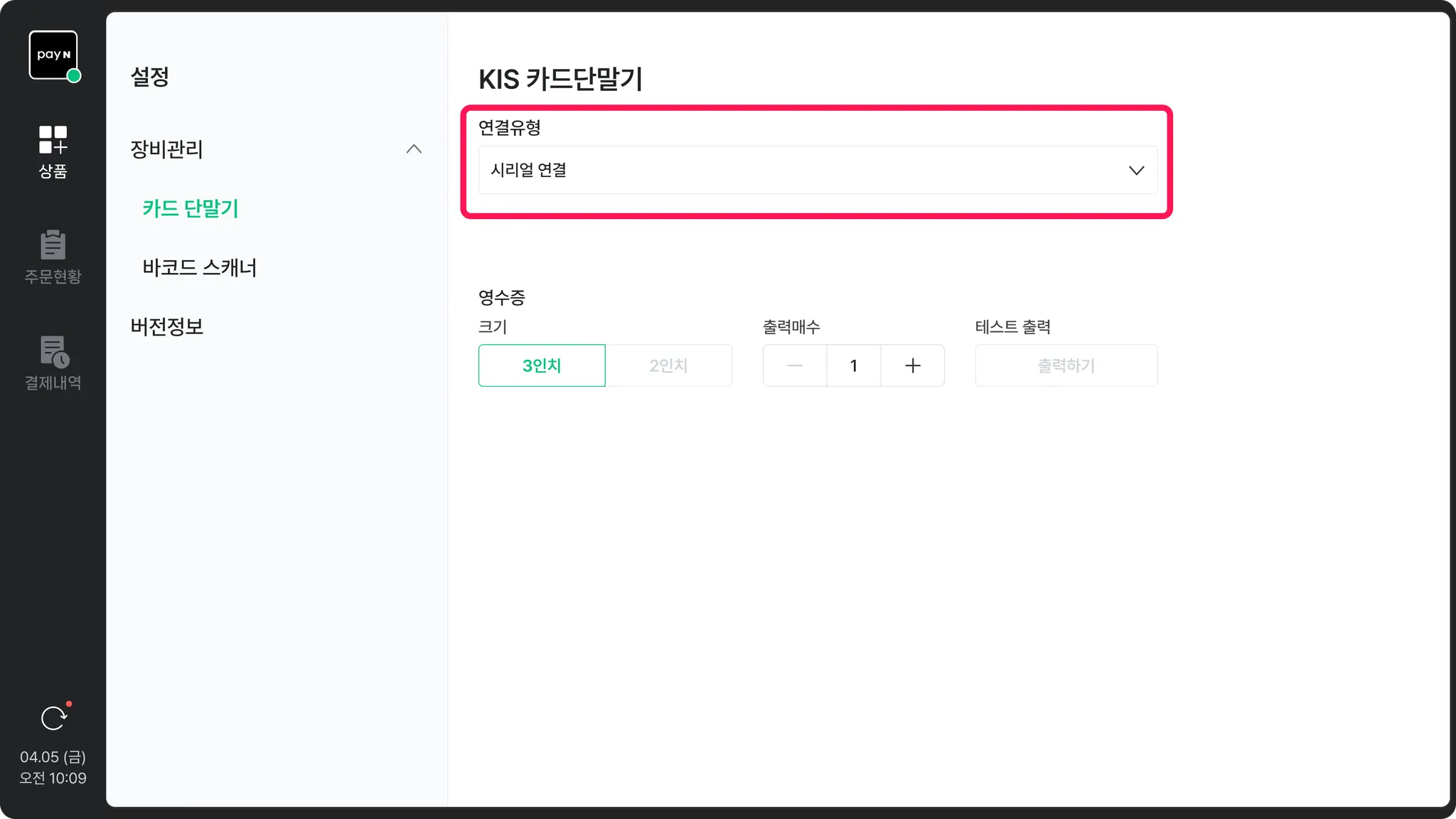 [장비관리] > [카드 단말기]에서 연결유형을 선택 후, 정보를 입력해 주세요.•