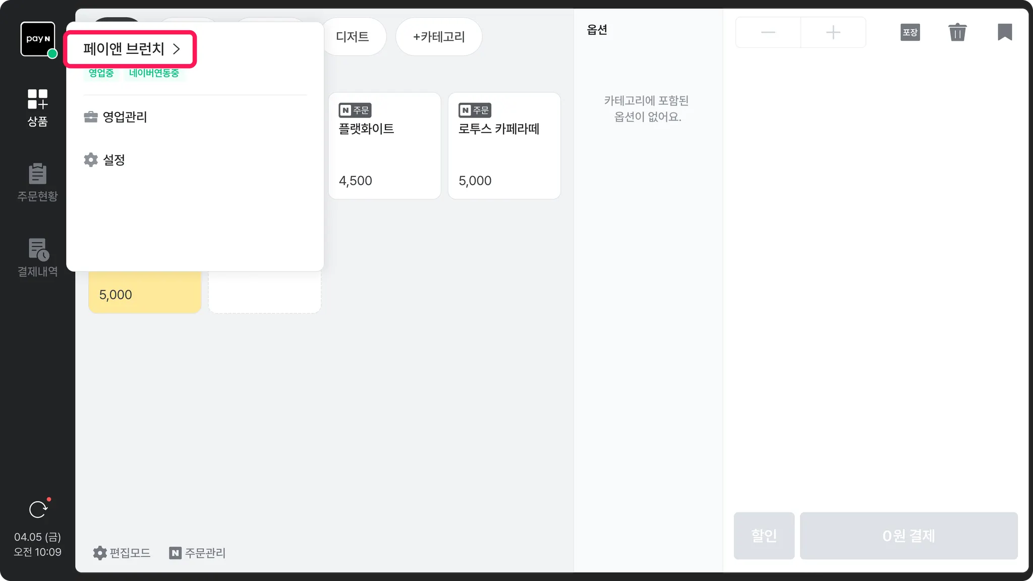 좌측 상단 [로고] > [매장명]을 눌러주세요. ex) 페이앤 브런치
