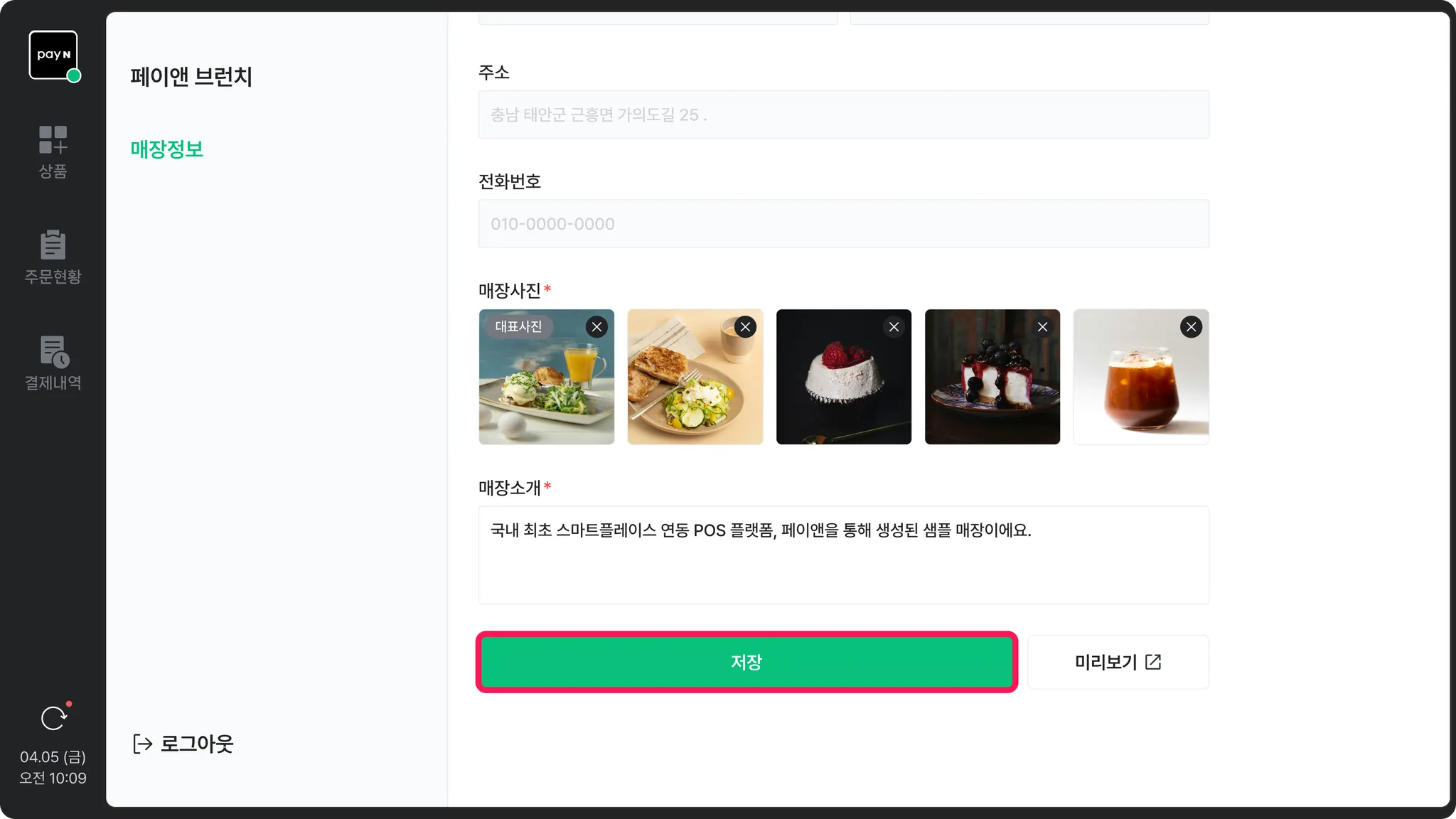 매장 사진 및 매장 소개를 설정한 후, [저장]을 눌러주세요.