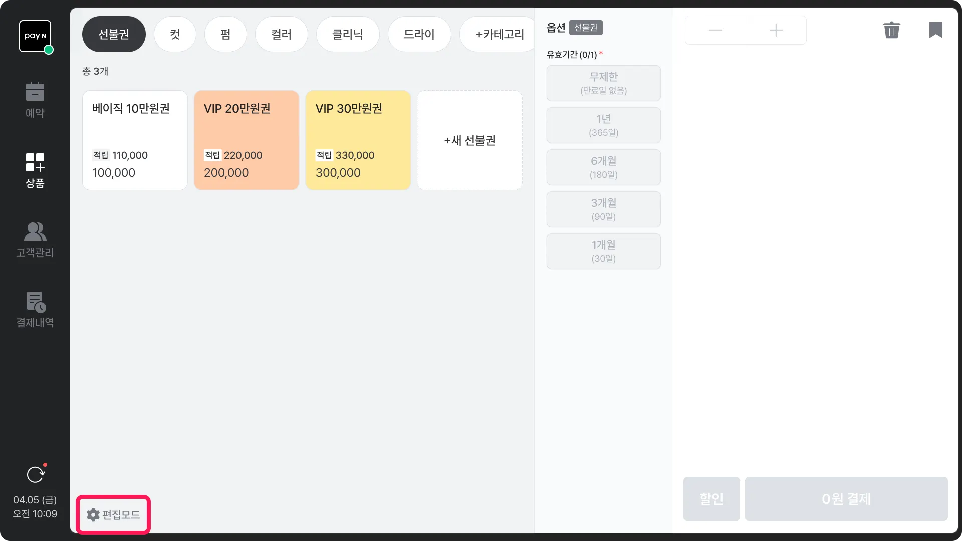 편집모드]를 누른 후, 수정할 선불권을 선택해 주세요.