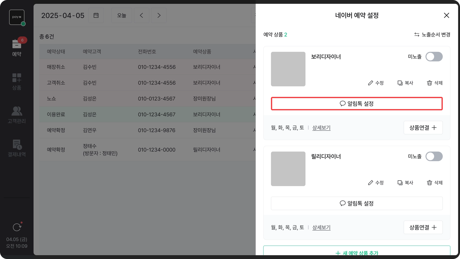 설정하실 예약 상품의 [알림톡 설정]을 눌러주세요.