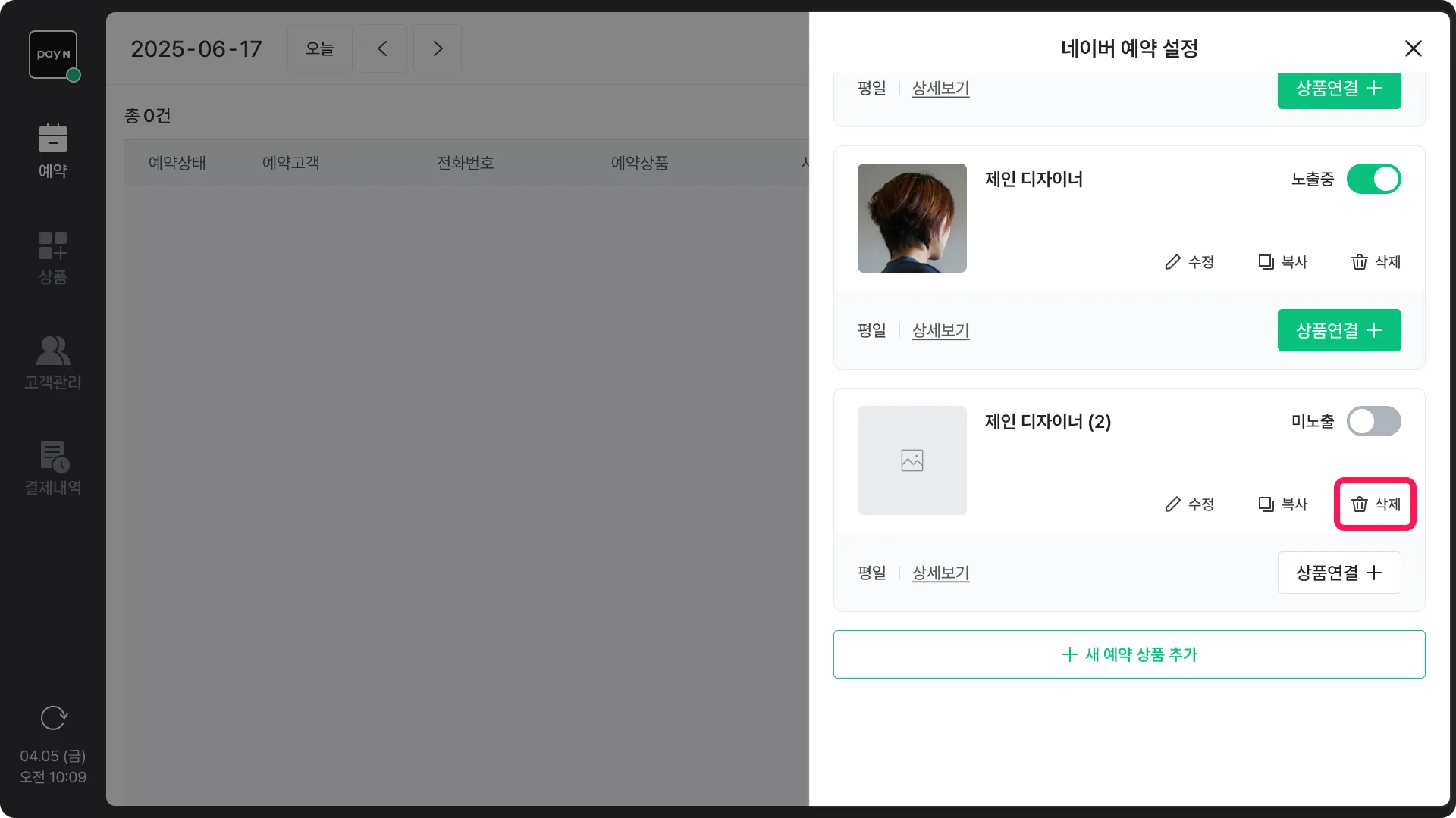 삭제할 예약 상품의 [삭제] 아이콘을 눌러주세요.