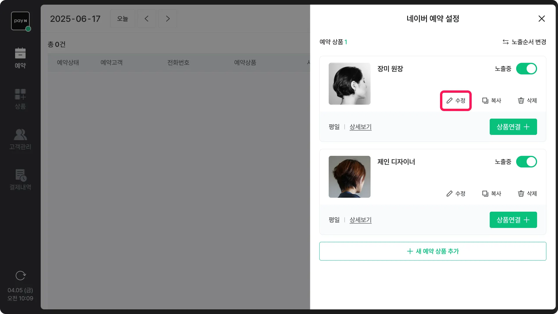 수정할 예약 상품의 [수정] 아이콘을 눌러주세요.
