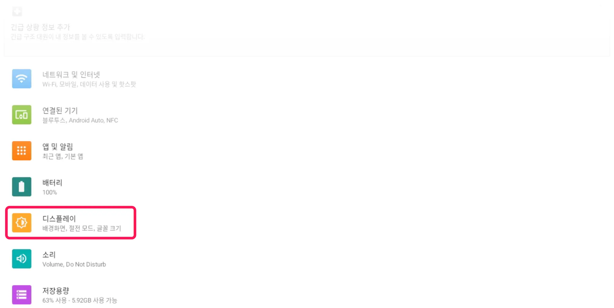 안드로이드기기에서 [설정] > [디스플레이]를 눌러주세요.