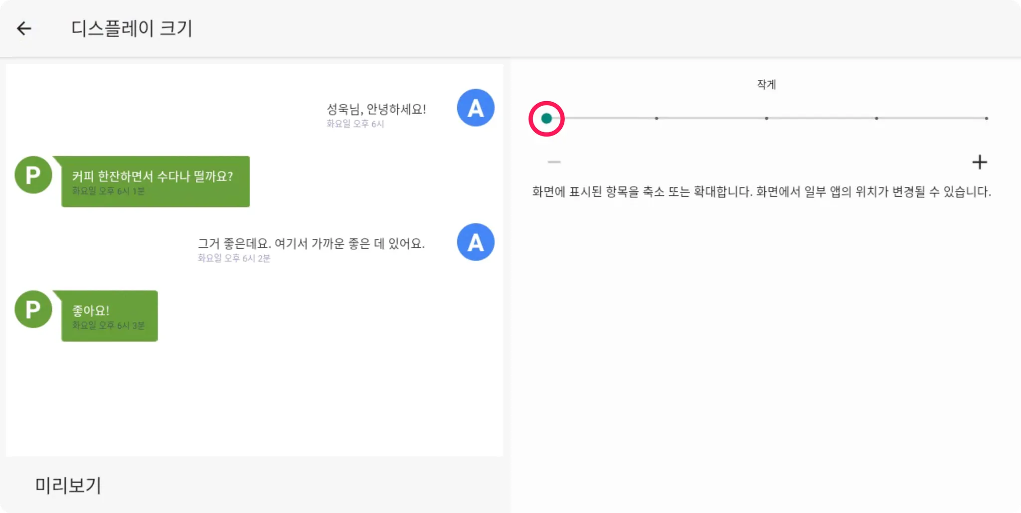 하단 [고급] > [디스플레이 크기]를 눌러, 아래와 같이 ‘최소(작게)’로 설정해 주세요.
