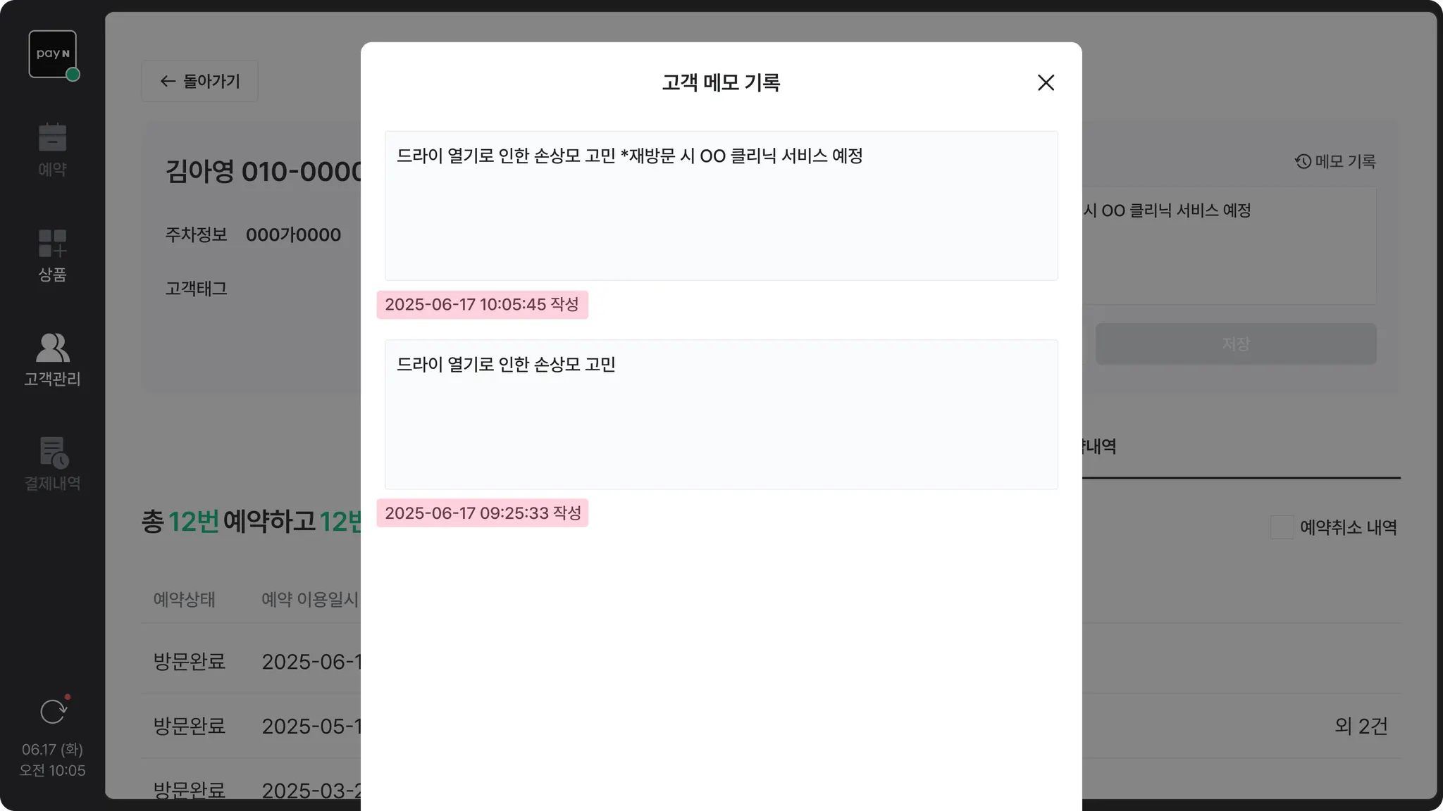 특이사항을 메모할 고객의 전화번호 또는 이름을 눌러주세요.