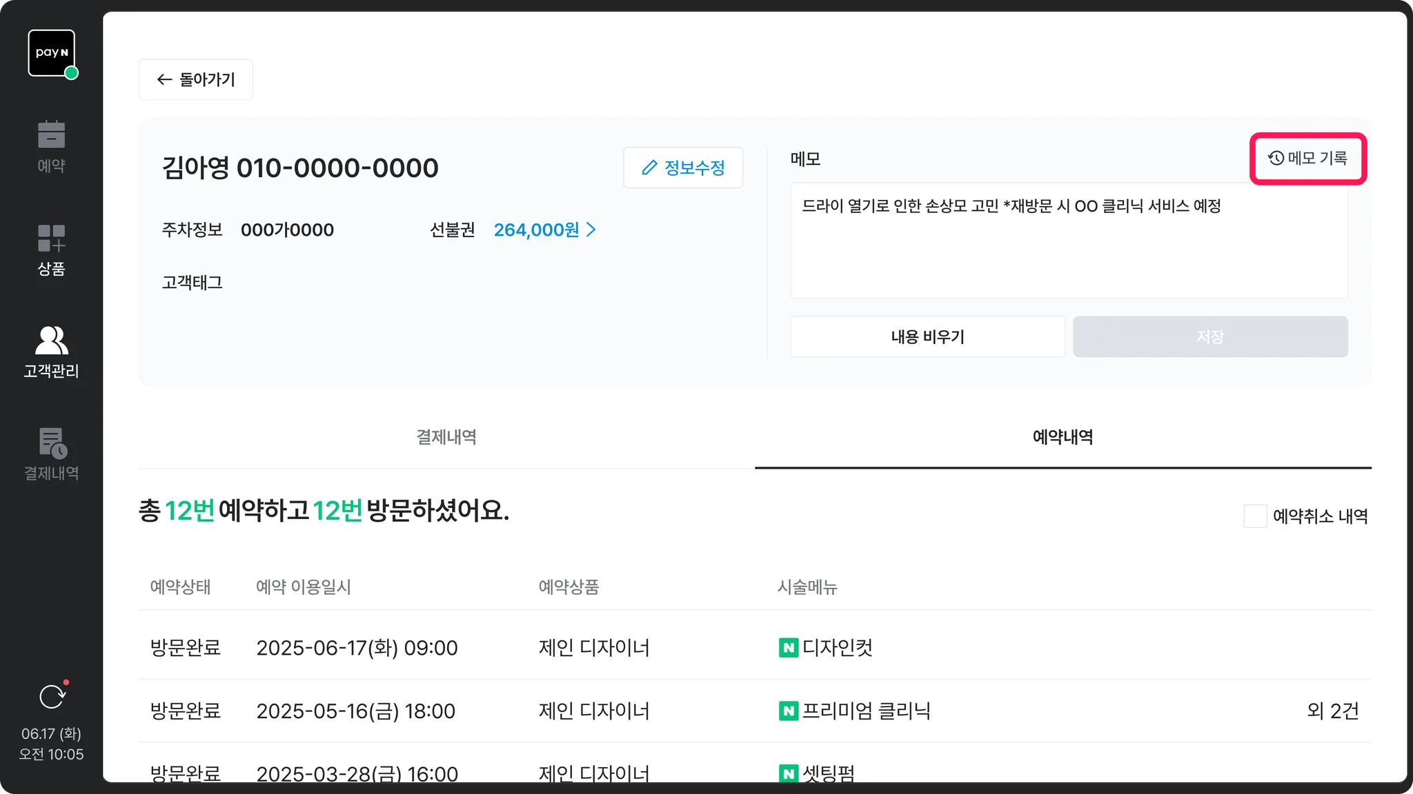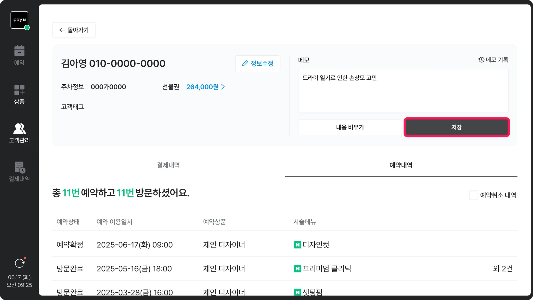 메모를 입력한 후, [저장]을 눌러주세요.결제/예약내역