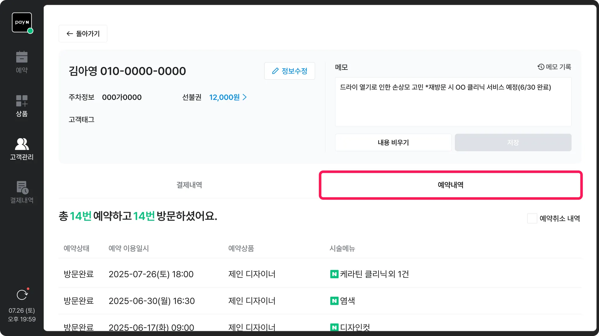 결제/예약내역을 확인할 고객의 전화번호 또는 이름을 눌러주세요.