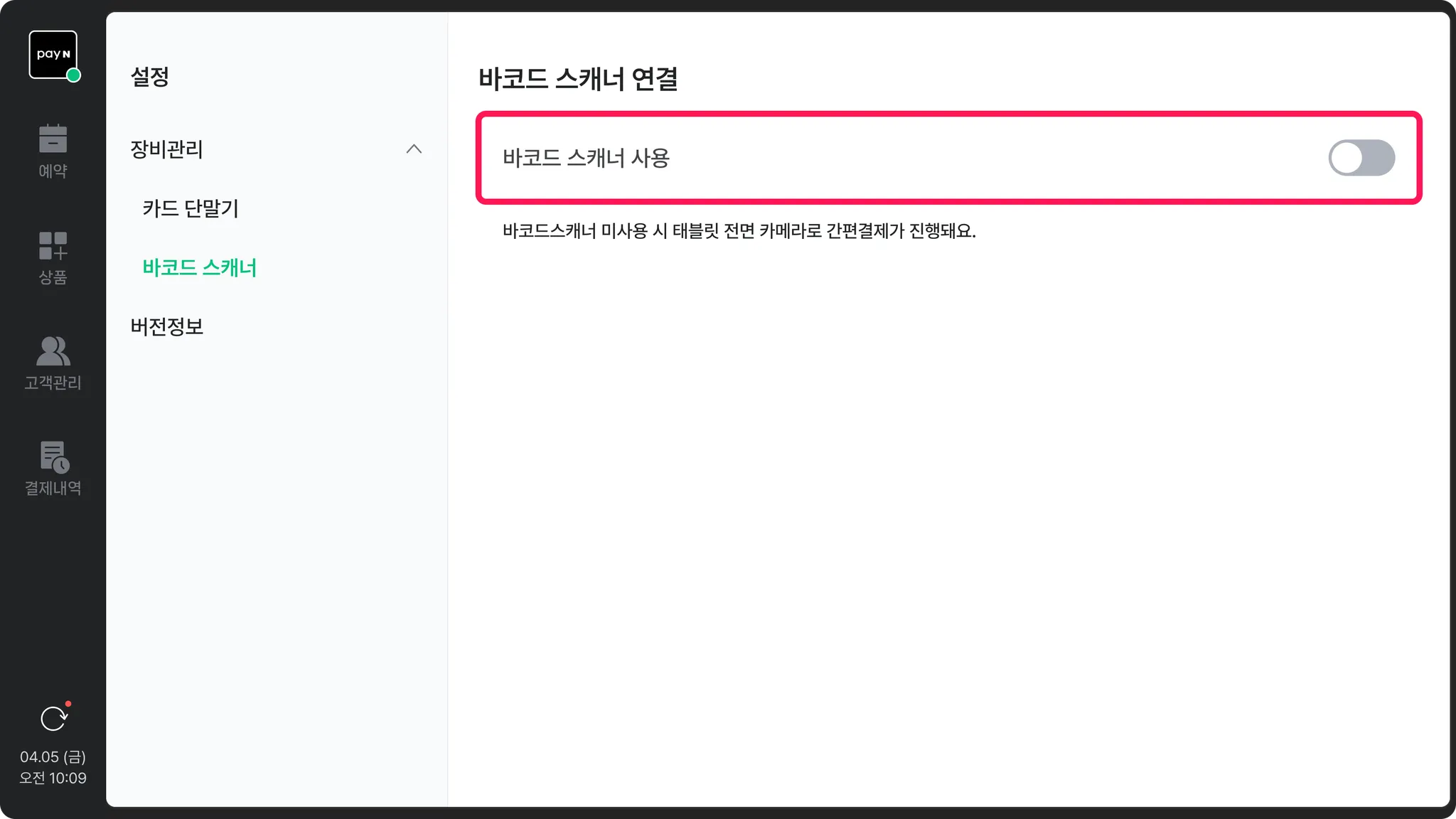 [장비관리] > [바코드 스캐너]에서 바코드 스캐너 사용을 활성화 해주세요.