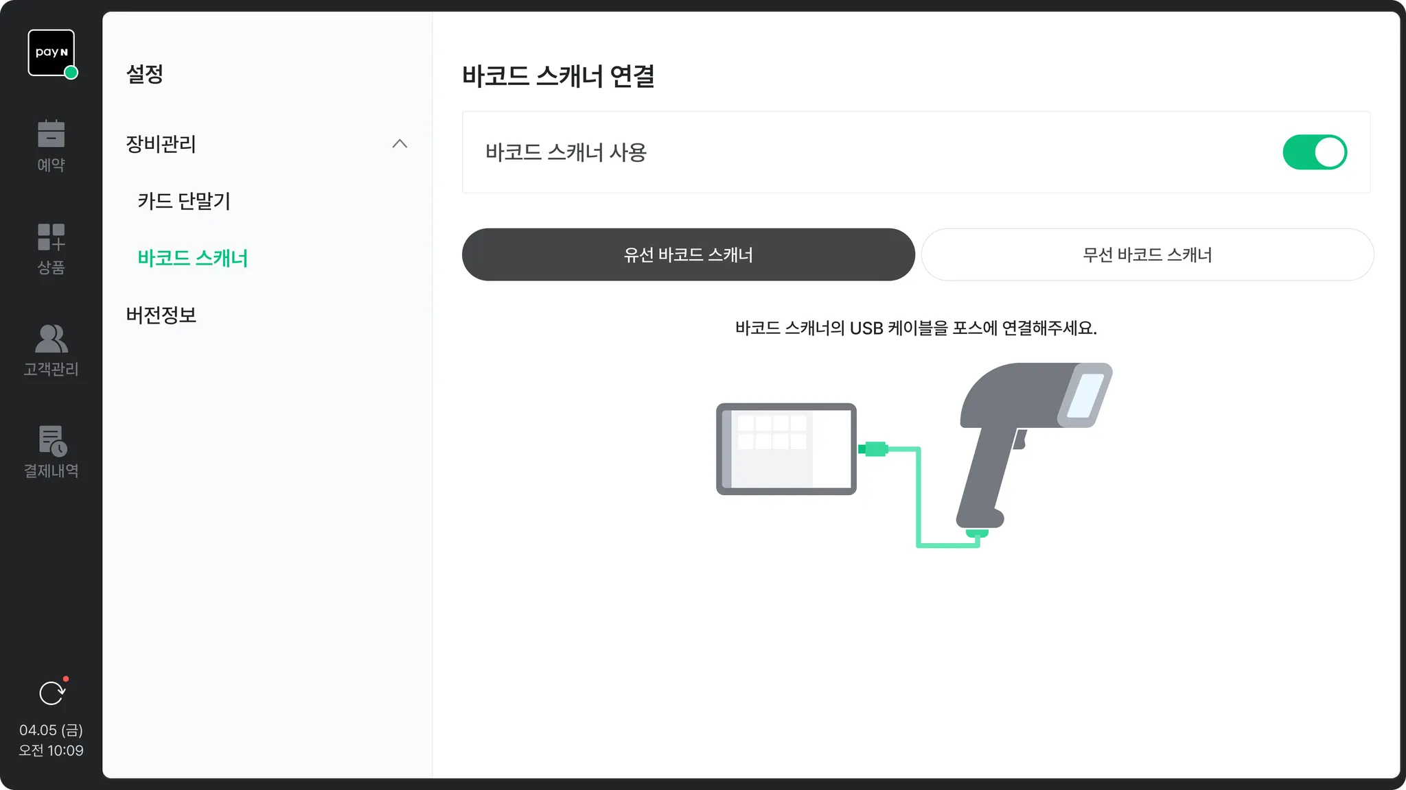 유선 바코드 스캐너 : 바코드 스캐너의 USB 케이블을 포스에 연결해 주세요.